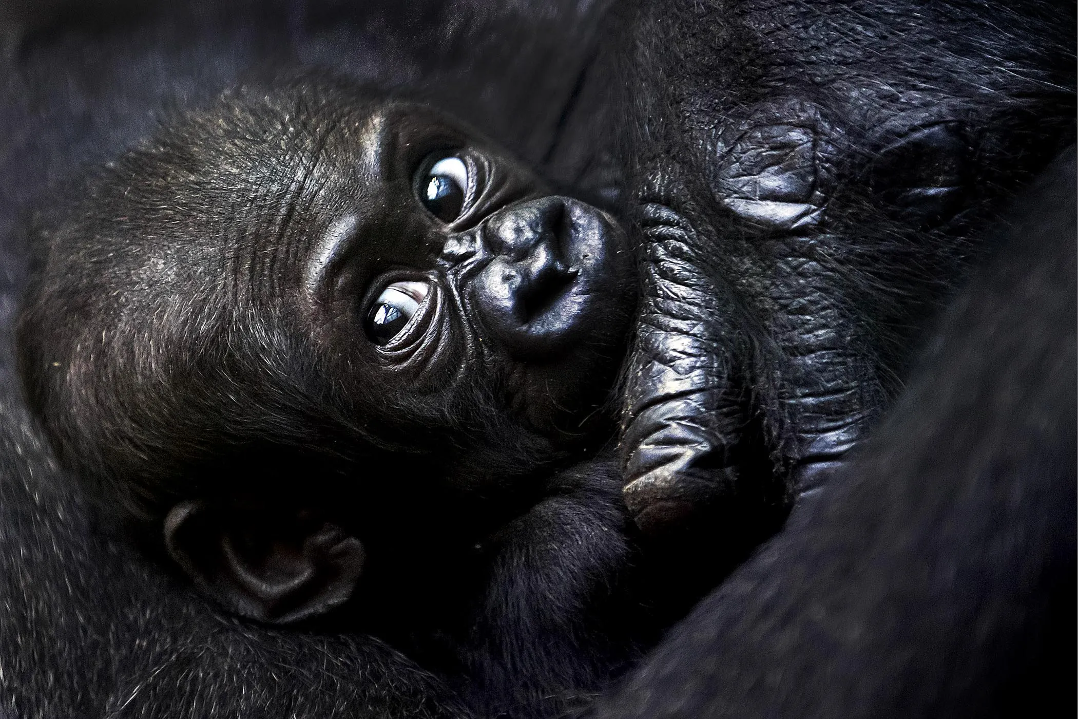 Mawimbi, a western lowland gorilla cub, lies in the arm of its mother Mamitu in the Zoo of Zurich, Switzerland, on September 19, 2012. (Photo by Alessandro Della Bella/Associated Press)