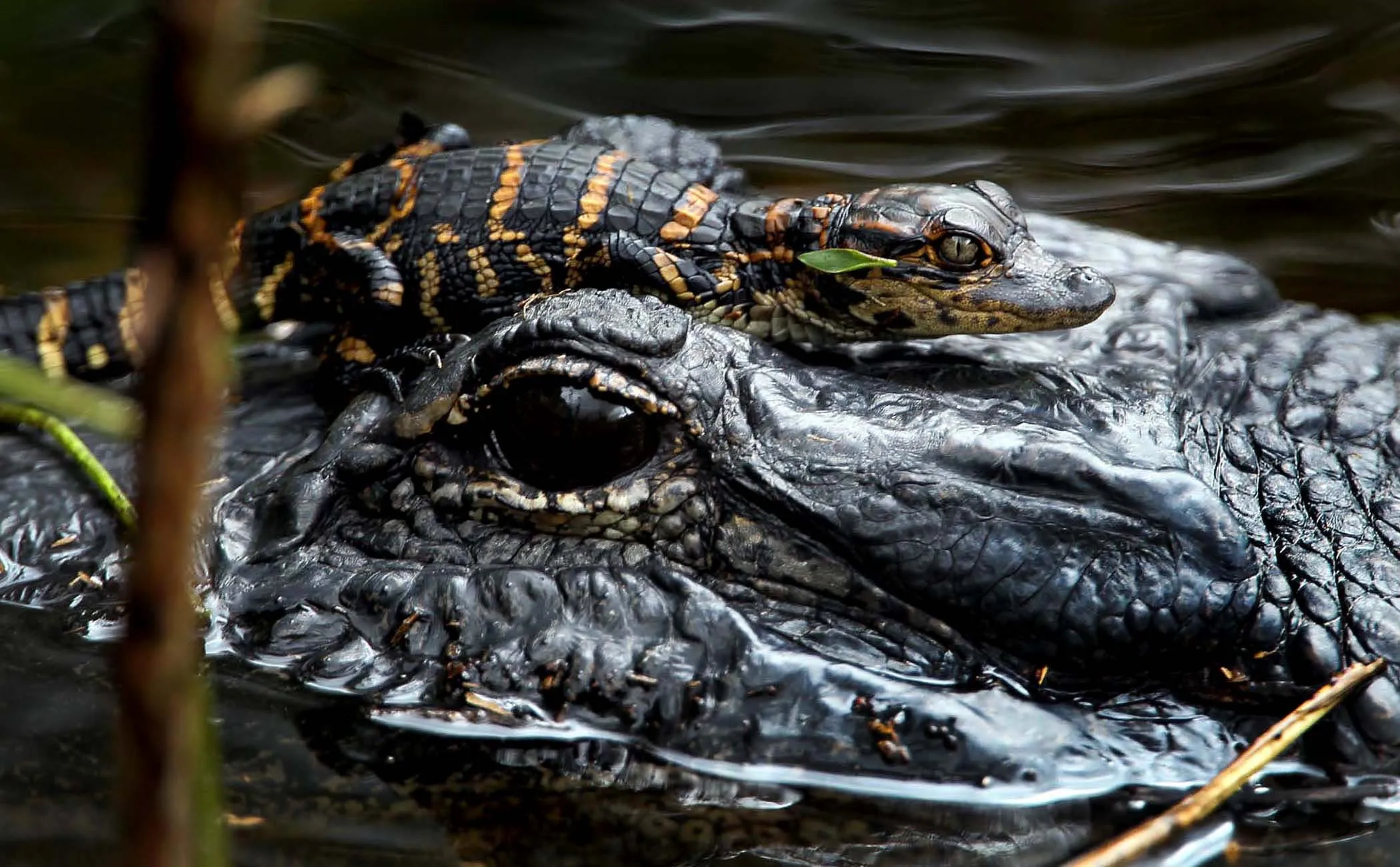 A baby alligator rests on its mother's head at the Loxahatchee Wildlife Refuge. (Photo by Allen Eyestone/The Palm Beach Post)