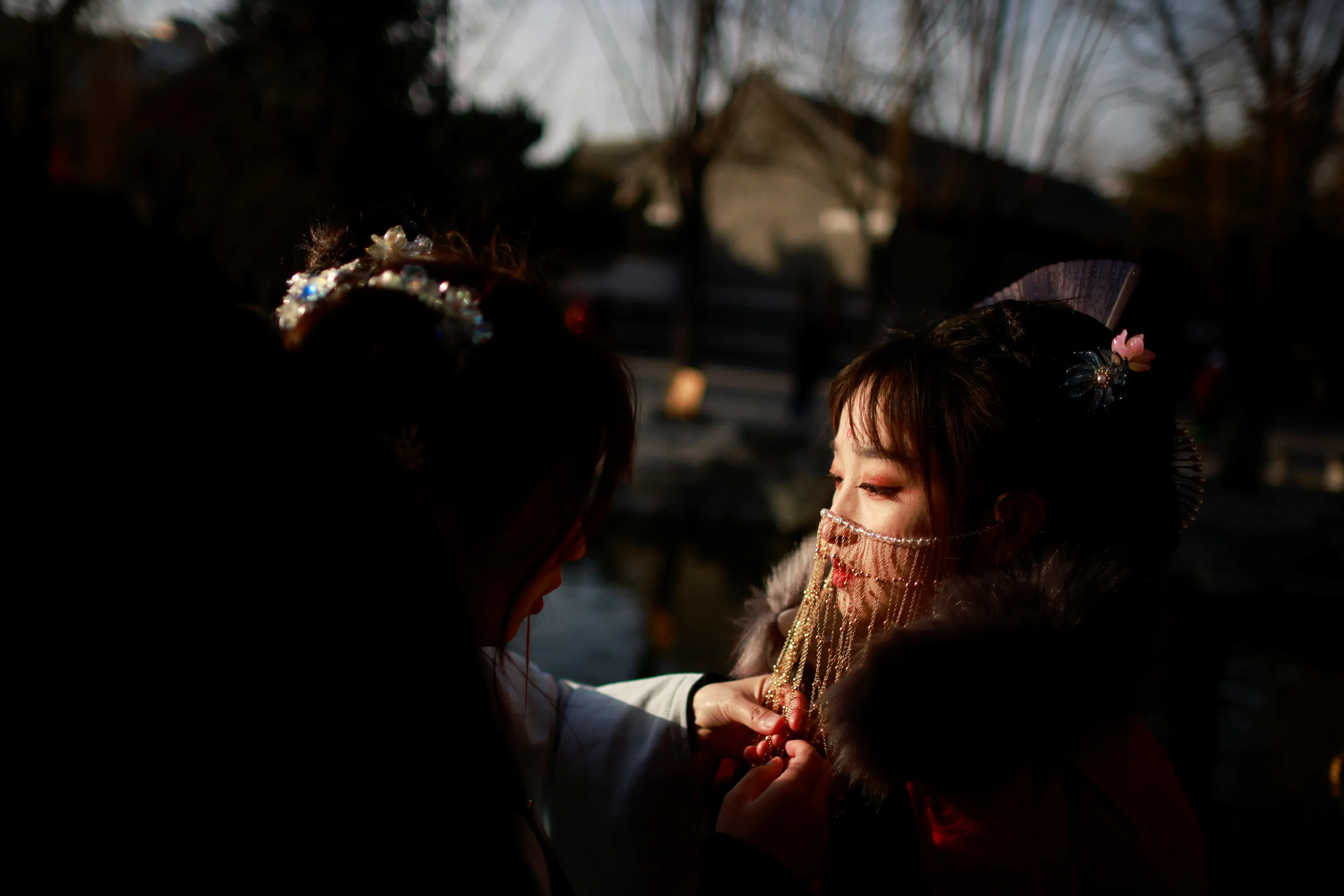 A woman adjusts the headgear of her friend's traditional hanfu dress in Daguanyuan Park as China celebrates Lunar New Year of the Ox following an outbreak of the coronavirus disease (COVID-19) in Beijing, China, February 15, 2021. (Photo by Thomas Peter/Reuters)