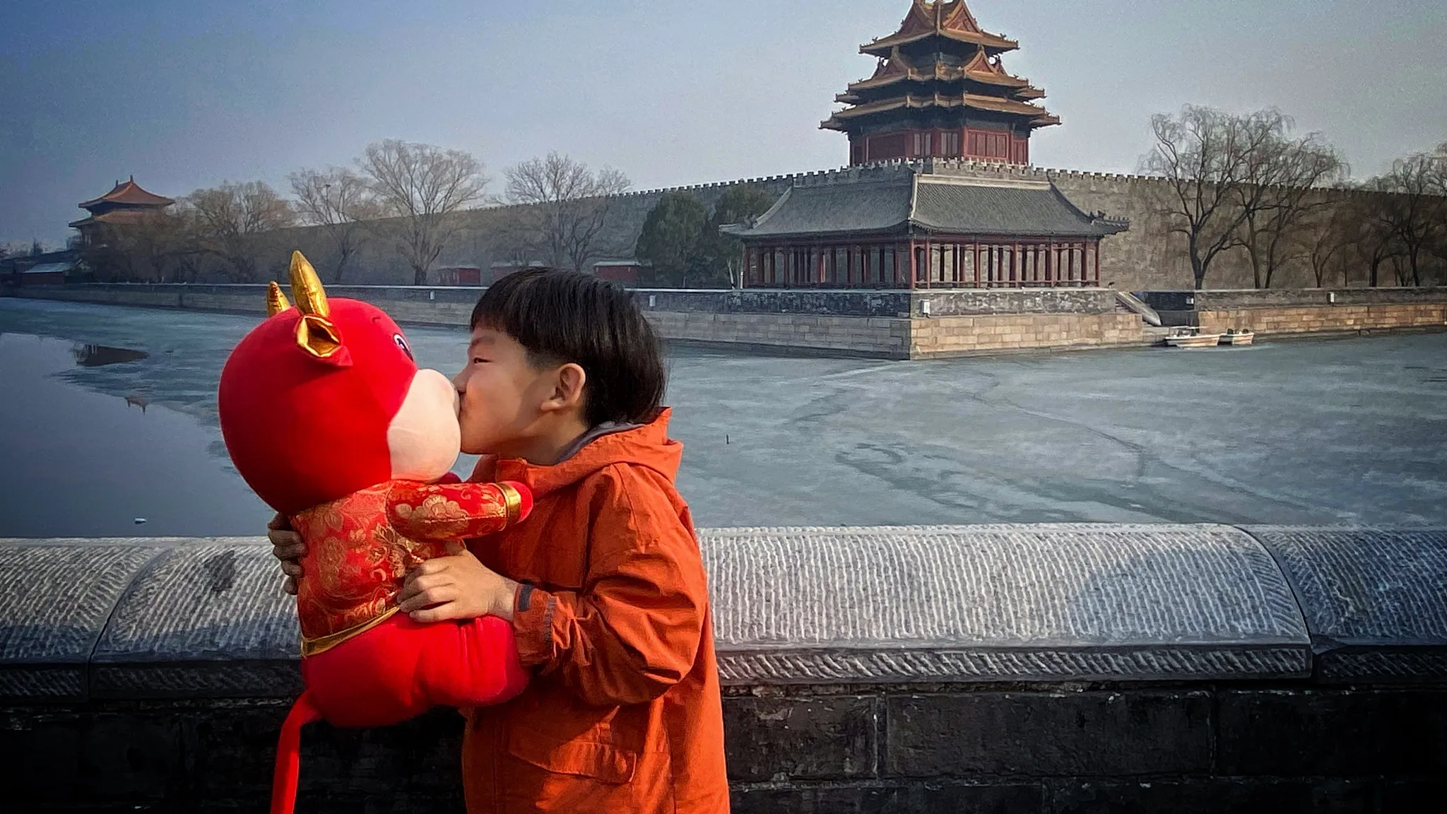 A boy is seen kissing a doll that represents the year of the Ox at the Palace Museum in Beijing, February 12, 2021. (Photo by CFP/China Stringer Network)
