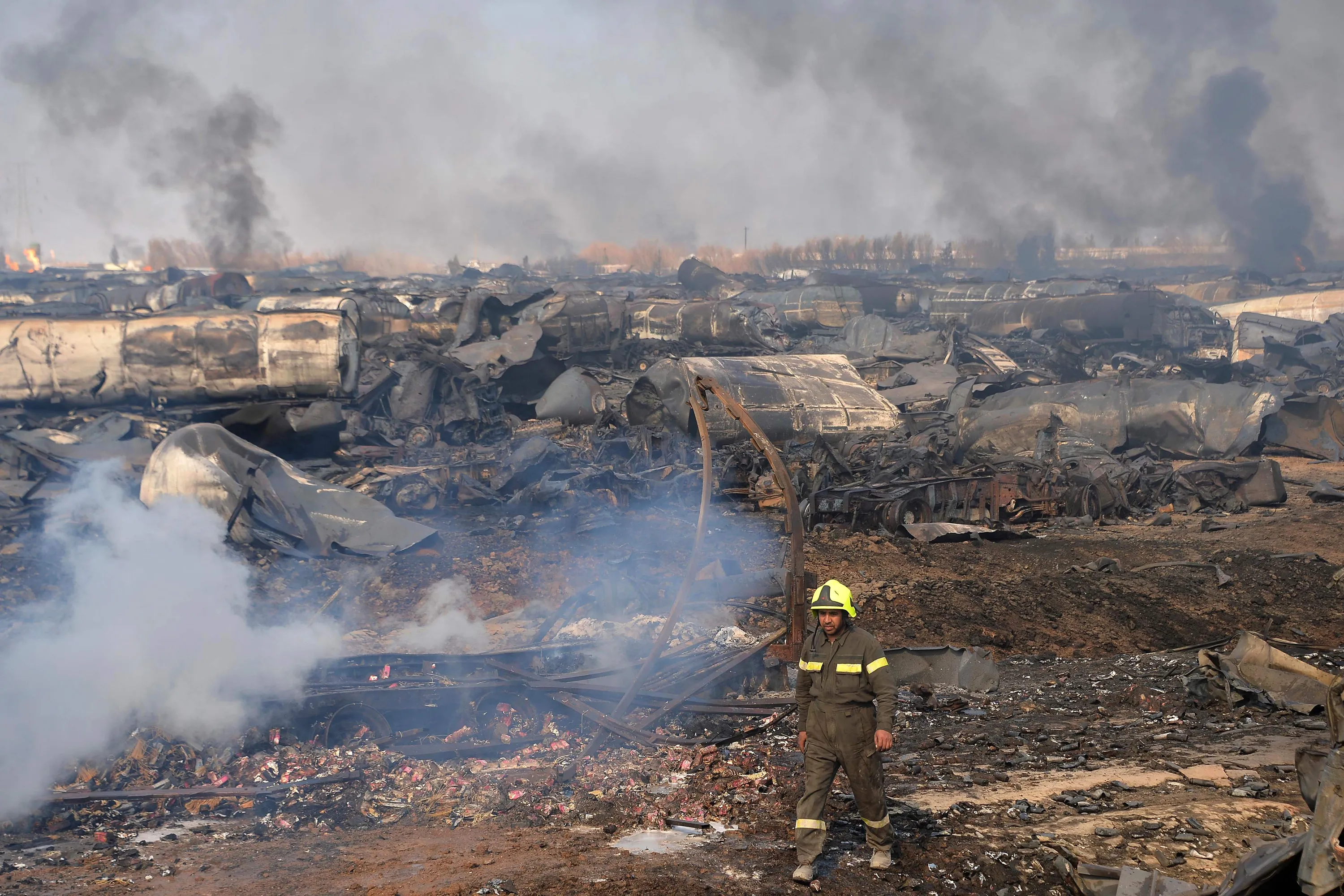 A firefighter walks amidst wreckage of gas tankers after a fire accident at Islam Qala on the outskirts of Herat, in the border between Afghanistan and Iran on February 14, 2021. (Photo by Hoshang Hashimi/AFP Photo)
