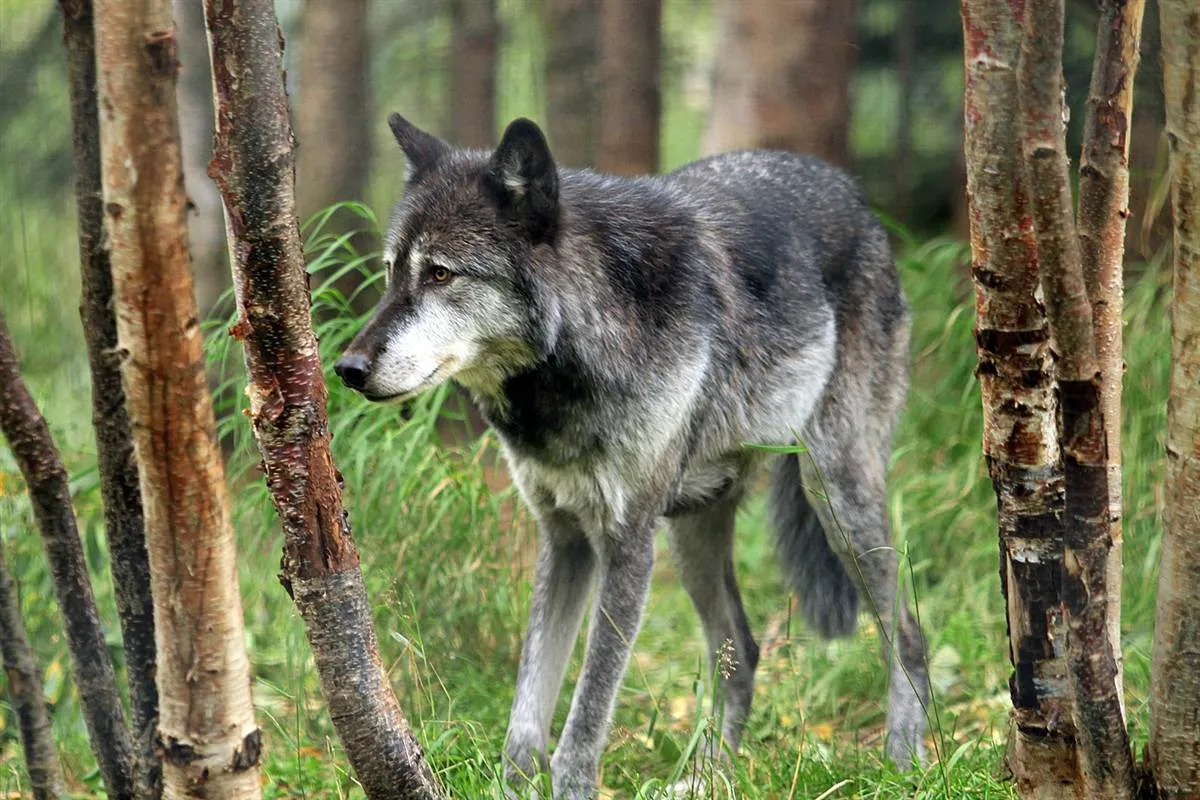 Denali, a male gray wolf, walks between trees at the Alaska Zoo, on September 5, 2012 in Anchorage, Alaska. The 6-year-old wolf is one of two candidates for Zoo “president” in a fundraiser that matches the timing of the U.S. presidential race. He's running against Ahpun, a polar bear, and ballots are $1. (Photo by Dan Joling/AP Photo)