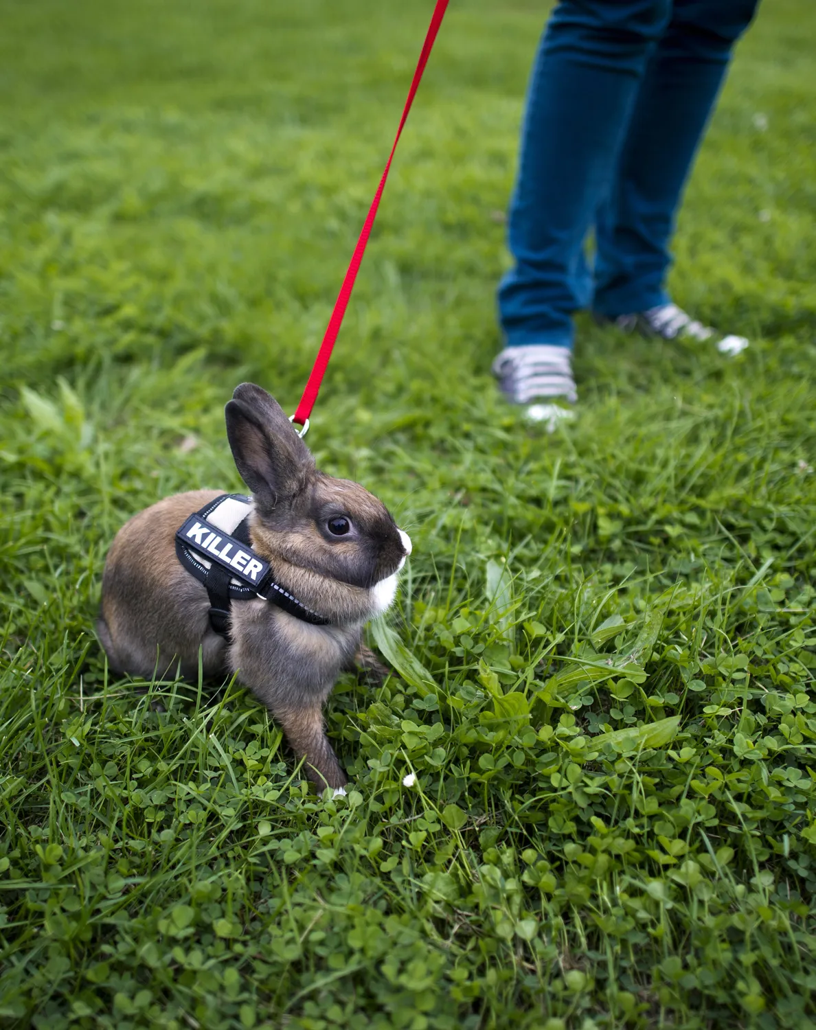 A rabbit wearing a harness with the imprint “Killer” is walked in during a pet fair Dresden, estern Germany, on September 5, 2012. (Photo by Arno Burgi/AFP)