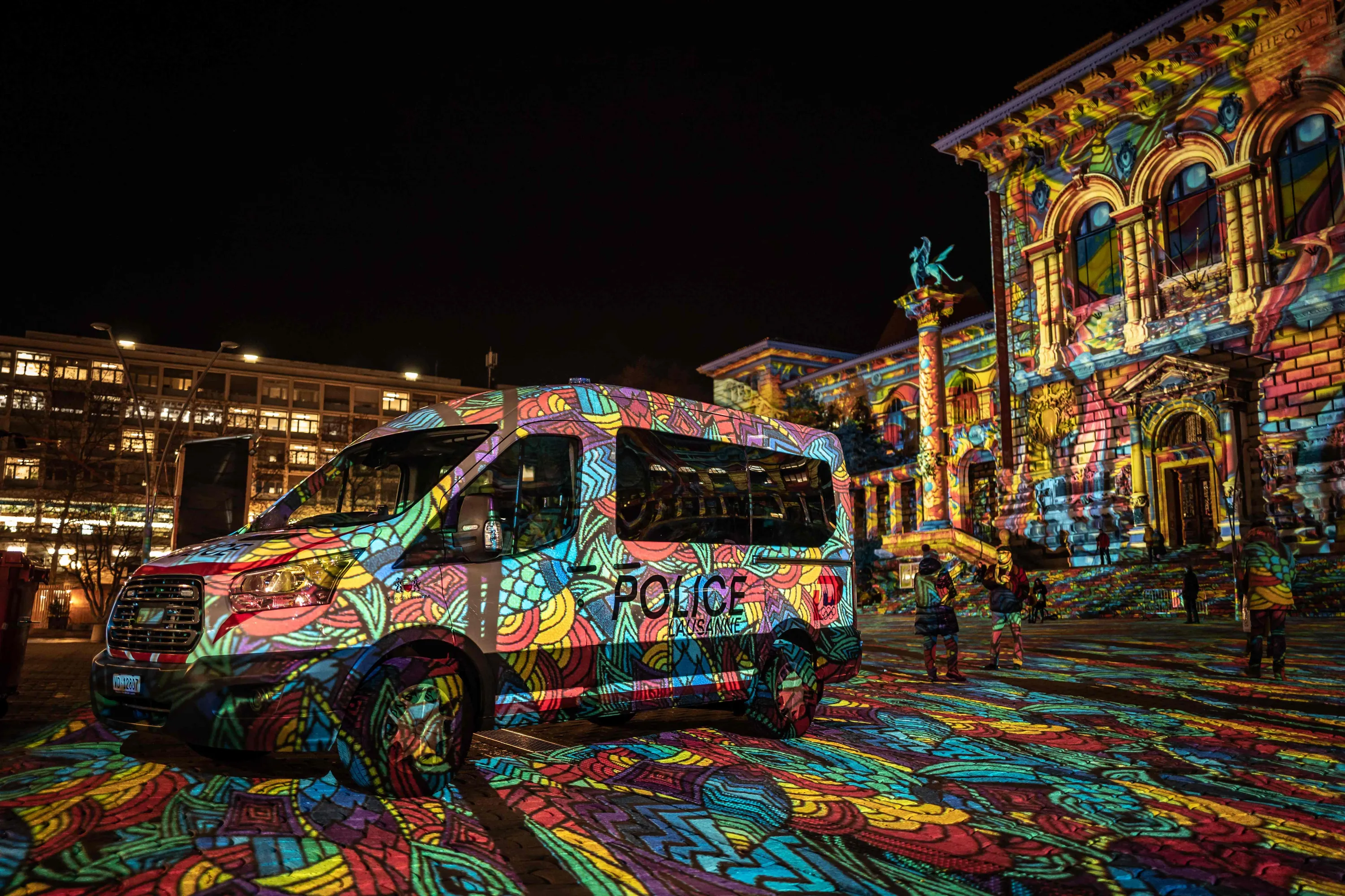 A picture taken on December 14, 2020 evening shows a police van illuminated by the lightshow of “Festival Lausanne Lumières” at the Riponne place in the center of Lausanne, Switzerland. (Photo by Fabrice Coffrini/AFP Photo)