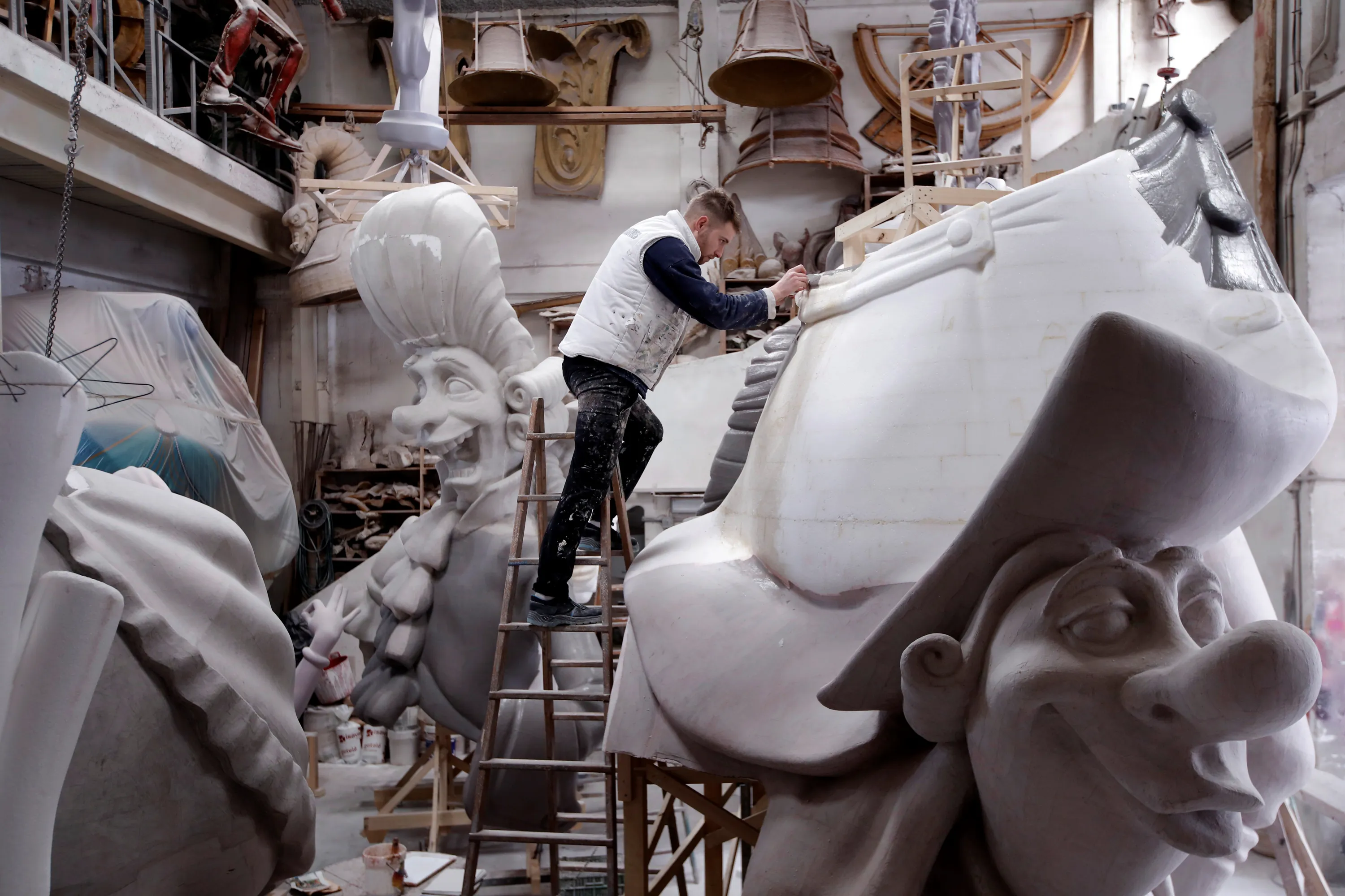 A craftsman works on a falla, a papier-mache sculpture, in his workshop despite that the Fallas festival was suspended for the second year in a row due to the coronavirus pandemic in Valencia, Spain, 26 February 2021. Local authorities planned a virtual Fallas Festival with several on-line initiatives. Las Fallas festivities are held annually in Valencia from 15 to 19 March to commemorate Saint Joseph, the patron saint of carpenters. (Photo by Biel Alino/EPA/EFE)