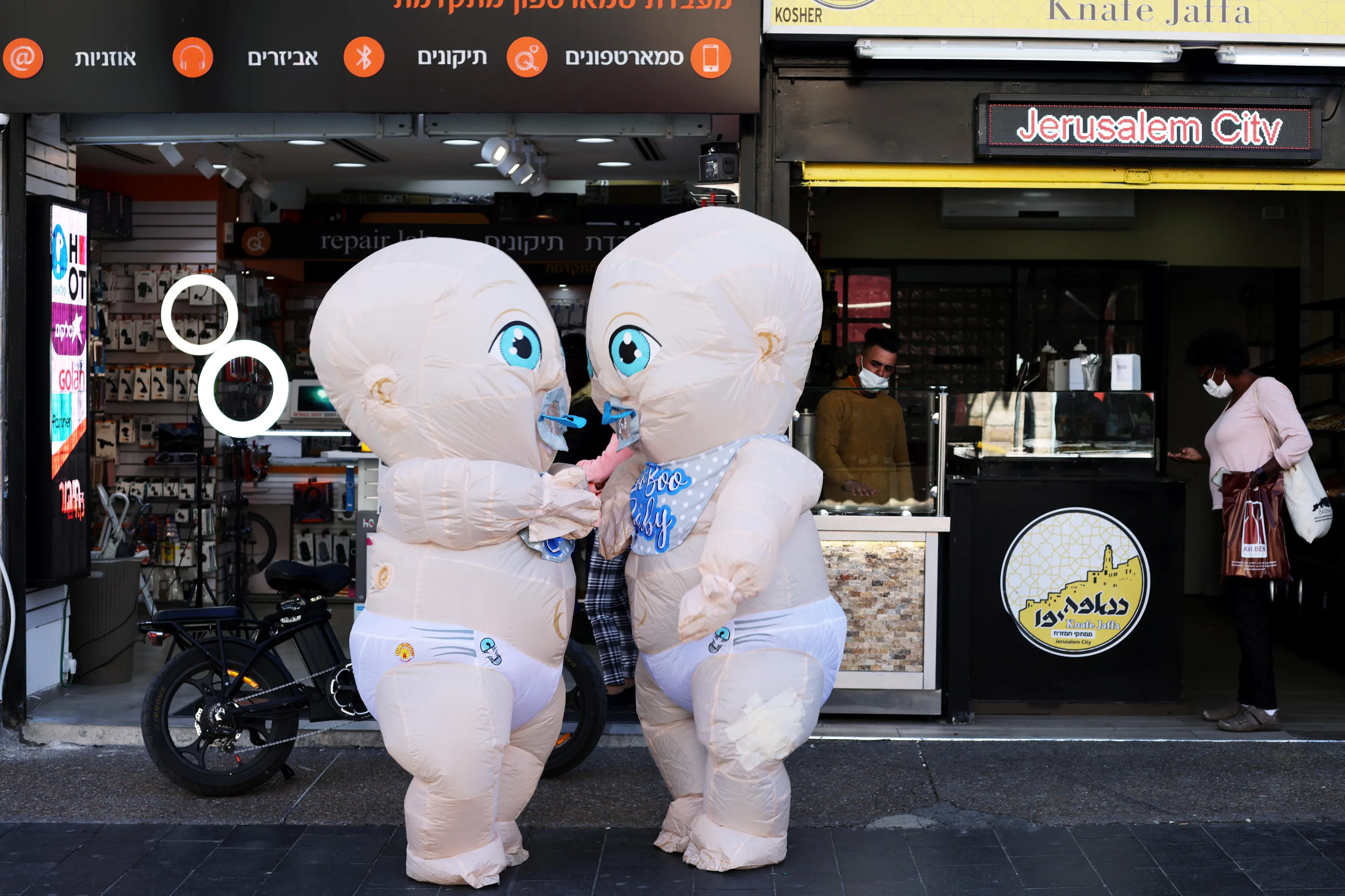 People wear dress-up costumes during the Jewish holiday of Purim, which is a celebration of the Jews' salvation from genocide in ancient Persia, in the center of Jerusalem on February 26, 2021. (Photo by Ammar Awad/Reuters)