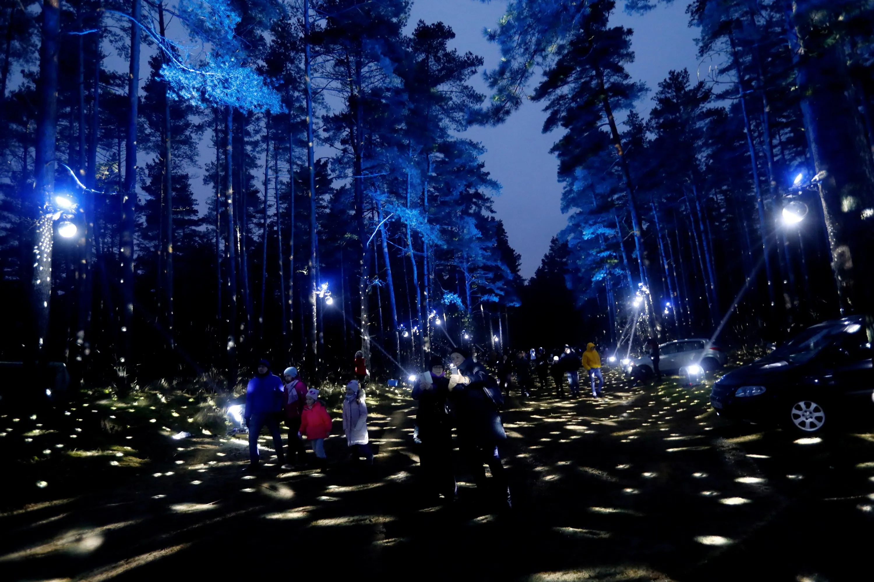 People walk in the illuminated city forest in Riga, Latvia on December 20, 2020. (Photo by Ints Kalnins/Reuters)
