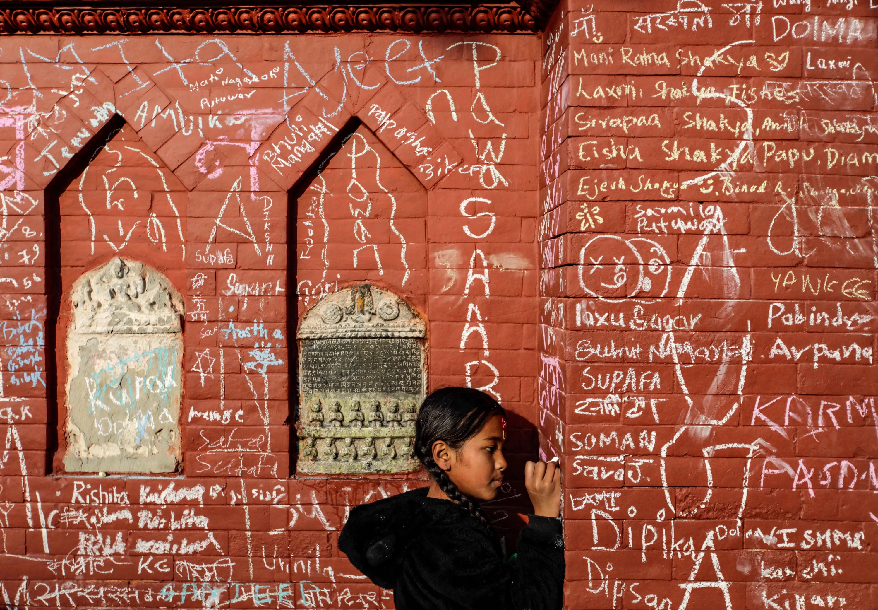 A girl writes on the wall of a Saraswati temple during the Shreepanchami festival dedicated to goddess of education Saraswati in belief that the goddess will help devotees excel in education, in Kathmandu, Nepal on February 16, 2021. (Photo by Navesh Chitrakar/Reuters)