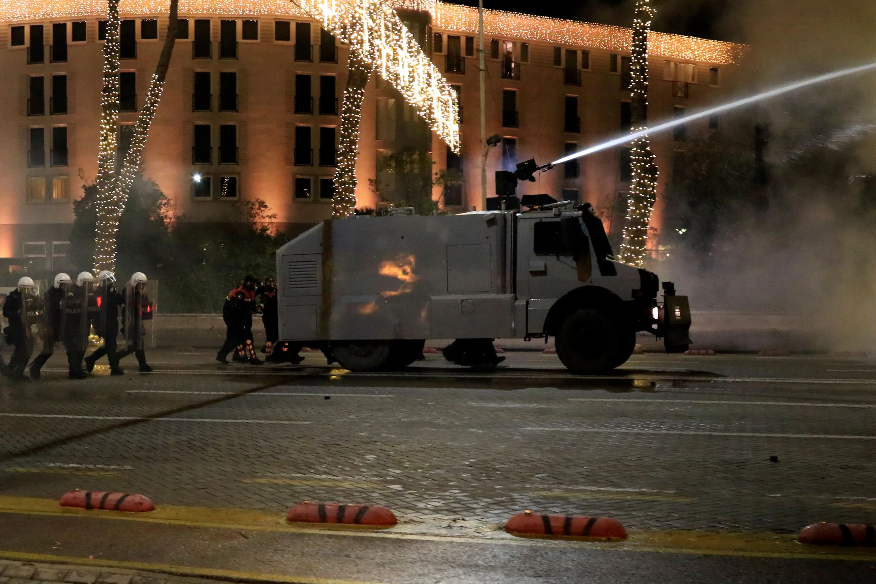 A police water cannon operates against protesters during clashes in Tirana, Friday, December 11, 2020. Albanian demonstrators clashed in the third day on Friday protesting for the death of a 25-year-old man shot dead by a police officer. (Photo by Hektor Pustina/AP Photo)