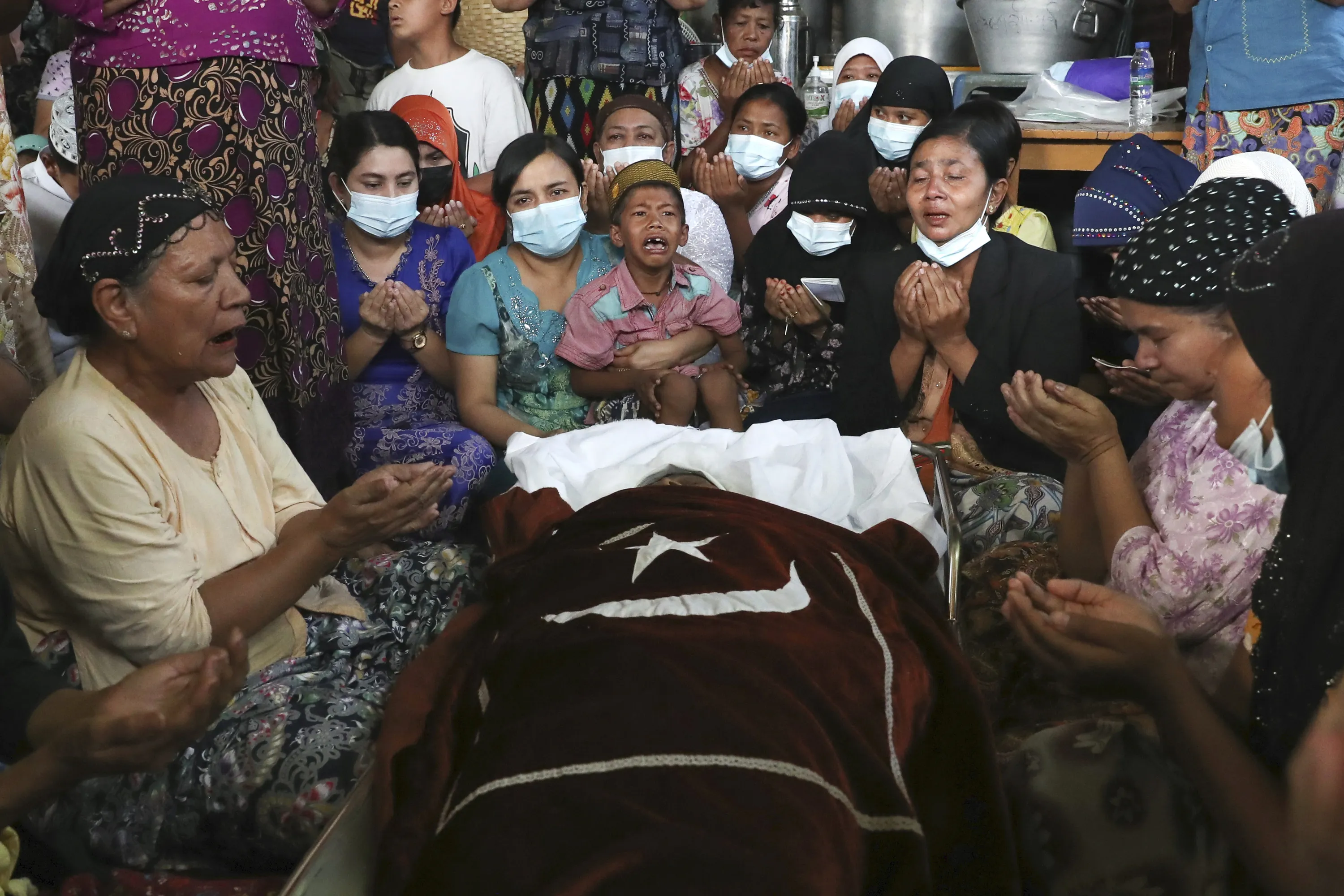 Family and relatives pray next to the body of the Muslim woman who her family said was killed by the army Sunday, during her funeral service in Mandalay, Myanmar, Monday, March 1, 2021. Defiant crowds returned to the streets of Myanmar's biggest city of Yangon on Monday, determined to continue their protests against the military's seizure of power a month ago, despite security forces having killed at least 18 people around the country just a day earlier. (Photo by AP Photo/Stringer)