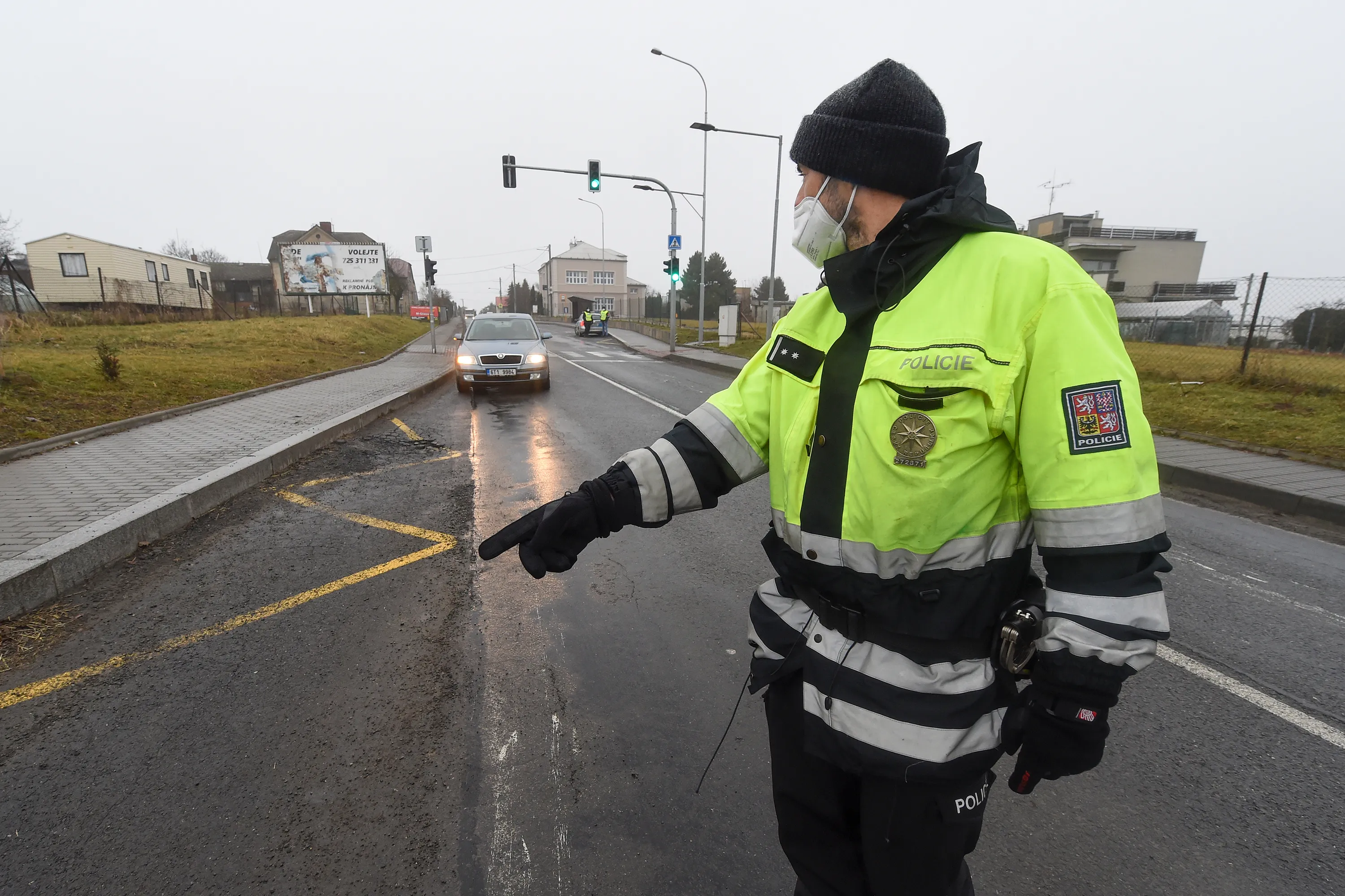 A police officer stops a car on a road between the towns, Ostrava and Opava, near Dehylov, Czech Republic Monday, March 1, 2021. Limits for free movement of people are set in the Czech Republic. Travelling to other counties unless the go to work or have to take care about relatives is prohibited. (Photo by Jaroslav Ozana/CTK via AP Photo)