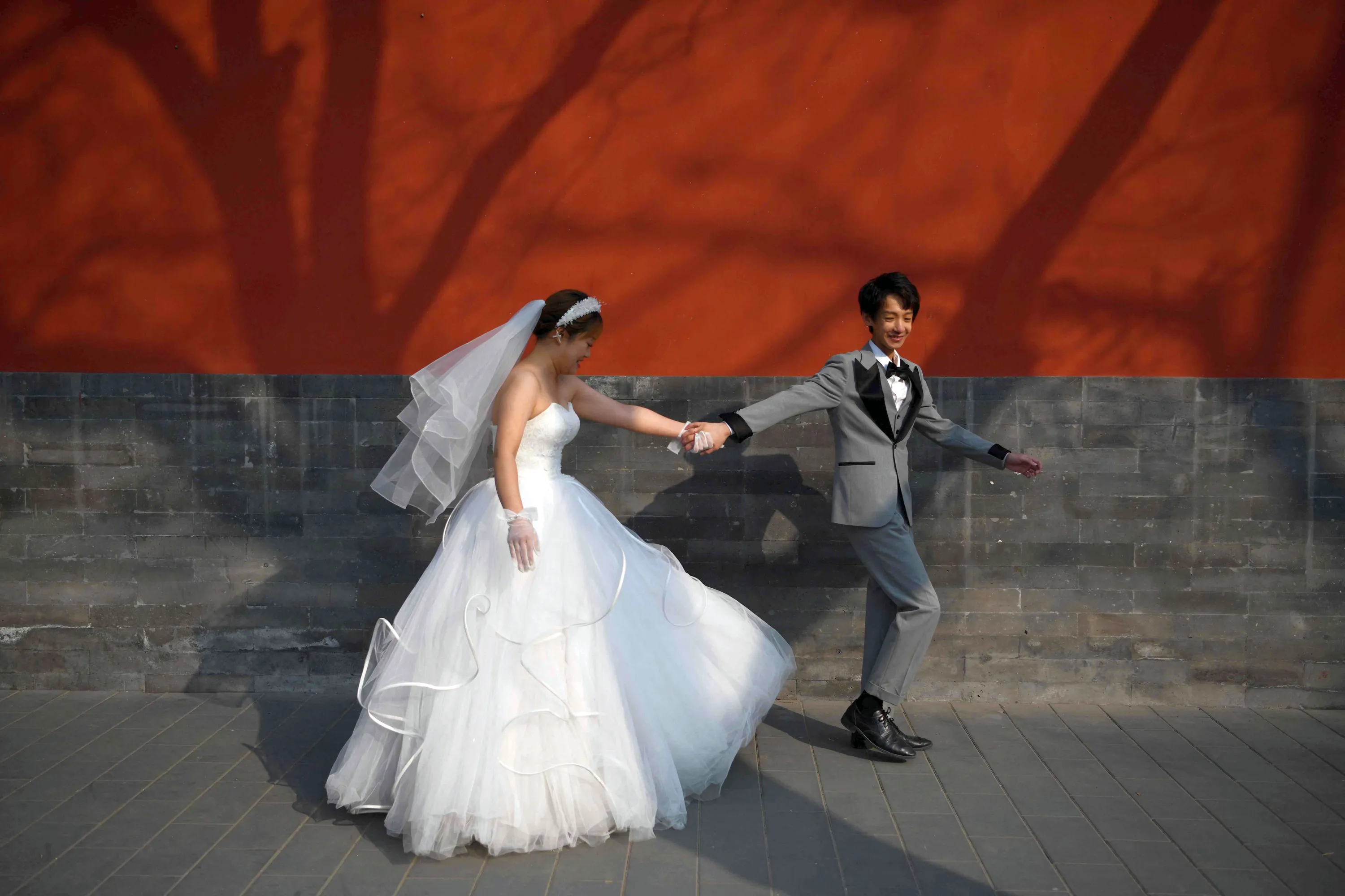 A couple poses for wedding photos on a street near the Forbidden City in Beijing on February 26, 2021. (Photo by Greg Baker/AFP Photo)
