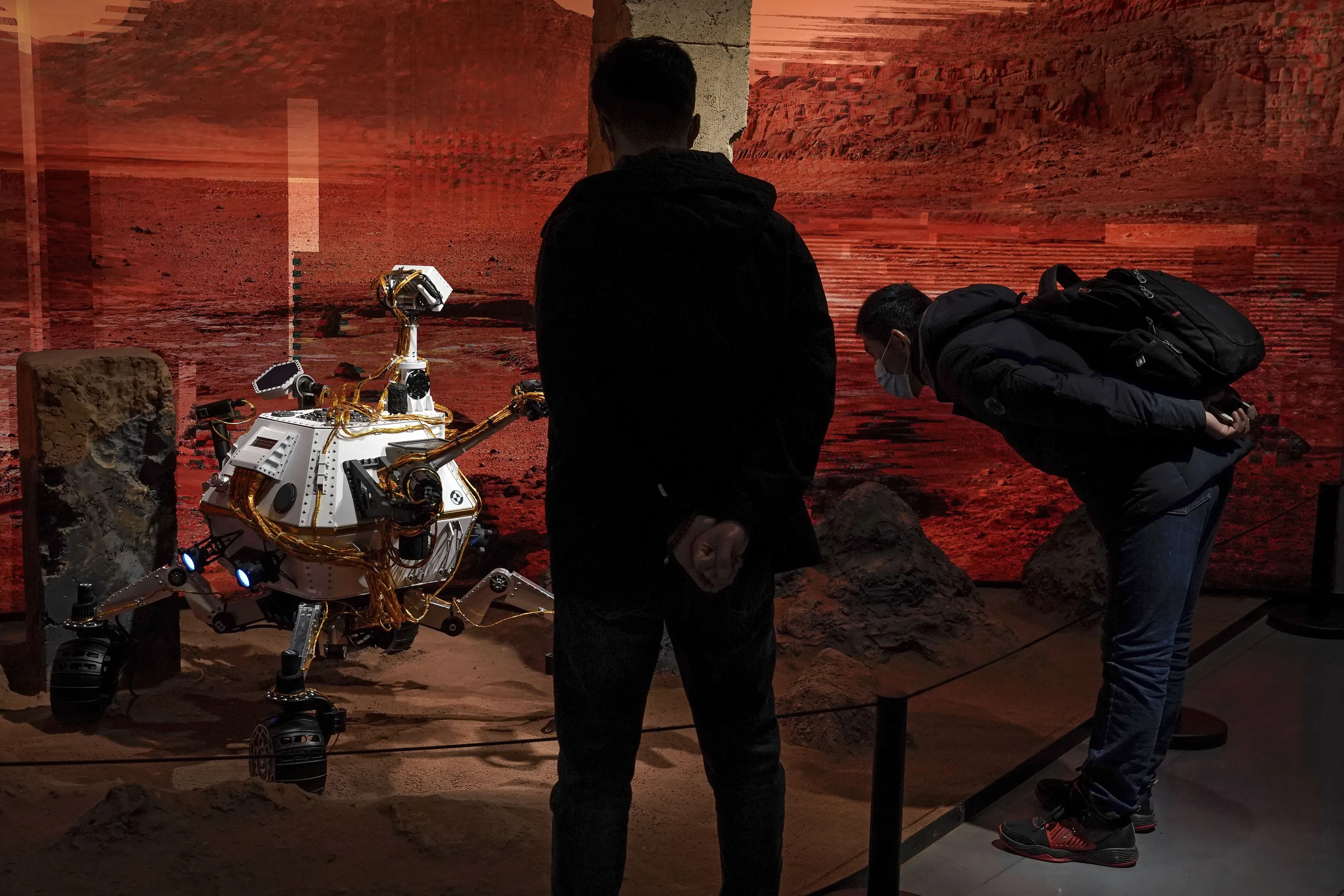 People wearing face masks to help curb the spread of the coronavirus look at a model depicting a rover on Mars during an exhibition at a shopping mall in Beijing on Wednesday, February 24, 2021. China says its Tianwen-1 spacecraft has entered a temporary parking orbit around Mars in anticipation of landing a rover on the red planet in the coming months. (Photo by Andy Wong/AP Photo)