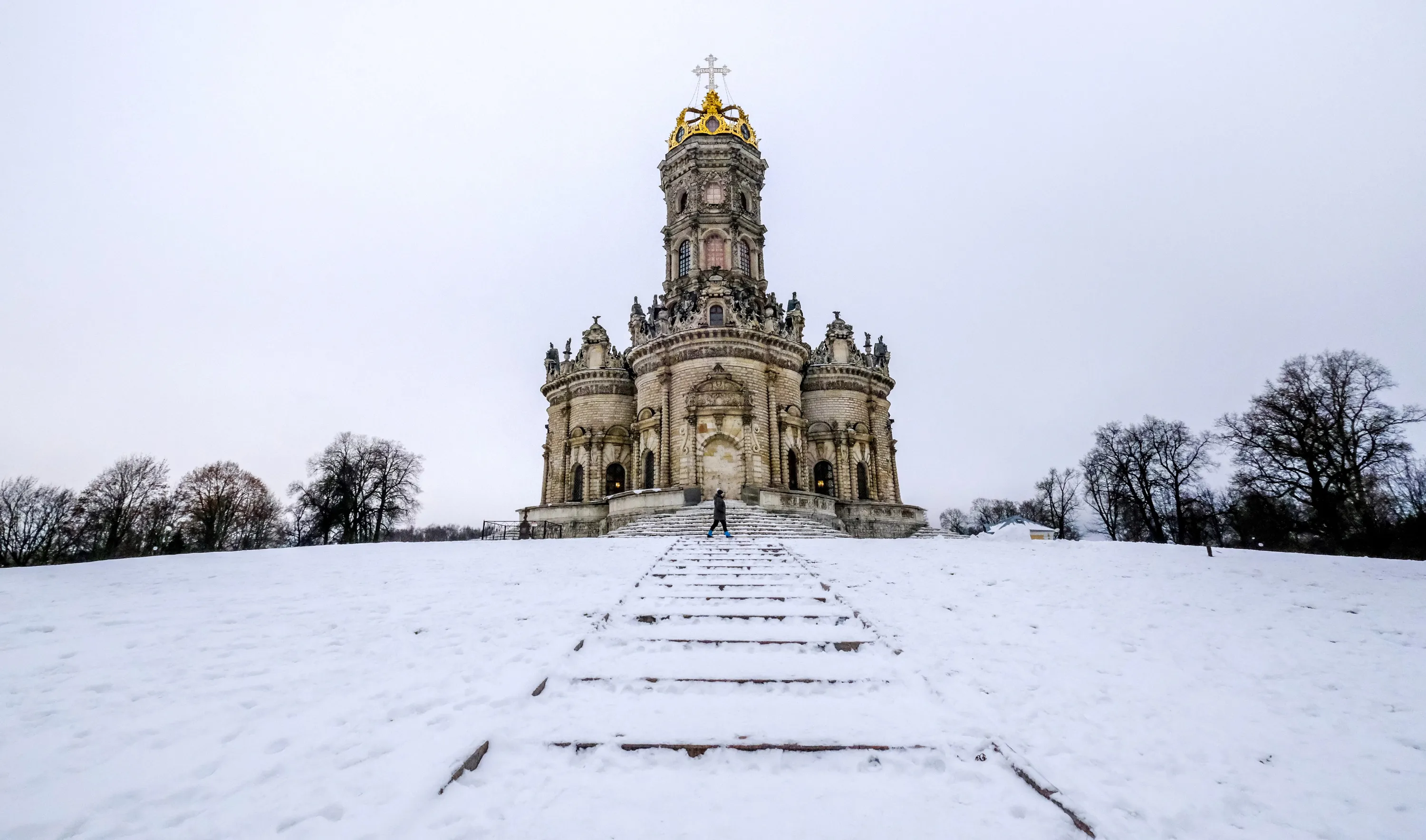 A woman walks past the Church of the Mother of God Holy Sign in the town of Podolsk outside Moscow on December 22, 2020. (Photo by Yuri Kadobnov/AFP Photo)