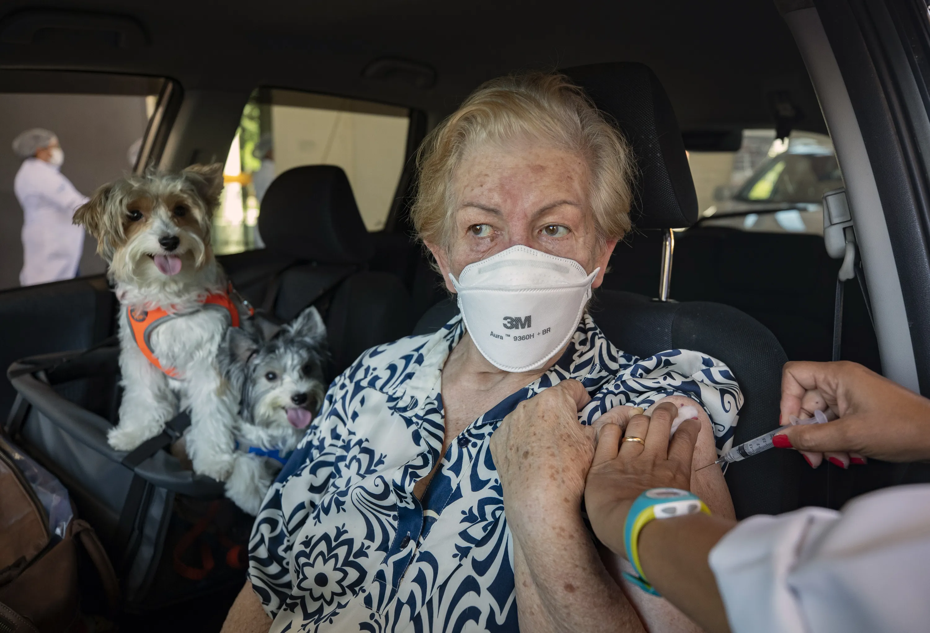 Maria Helena Alcantara gets a shot of the Sinovac COVID-19 vaccine while she sits in her car with her pets during a priority vaccination program for seniors at a drive-thru site set up in the Pacaembu soccer stadium parking lot in Sao Paulo, Brazil, Wednesday, March 3, 2021. (Photo by Andre Penner/AP Photo)