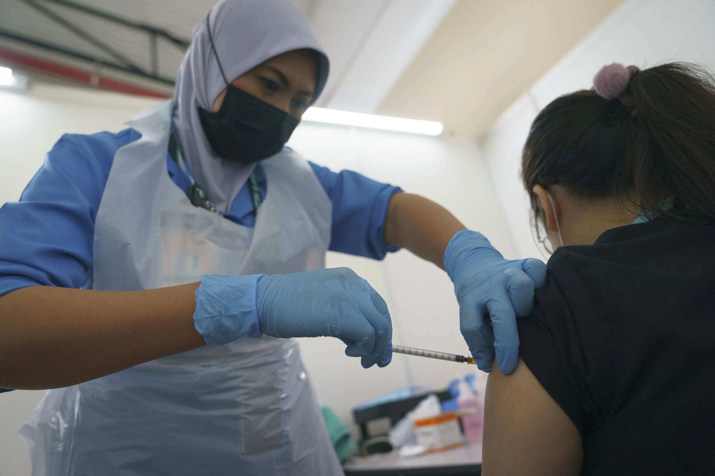A health worker administers the Pfizer COVID-19 vaccine to a health staff member at a vaccination center in Serdang, outskirt of Kuala Lumpur, Malaysia, Thursday, March 4, 2021. (Photo by Vincent Thian/AP Photo)