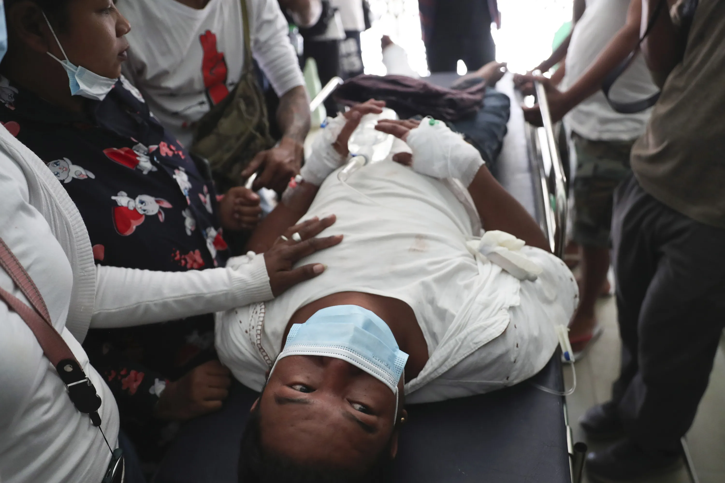 An injured protester is tended to during a demonstration against the military coup in Mandalay, Myanmar, Friday, February 26, 2021. Security forces in Myanmar's largest city on Friday fired warning shots and beat truncheons against their shields while moving to disperse more than 1,000 anti-coup protesters. (Photo by AP Photo/Stringer)