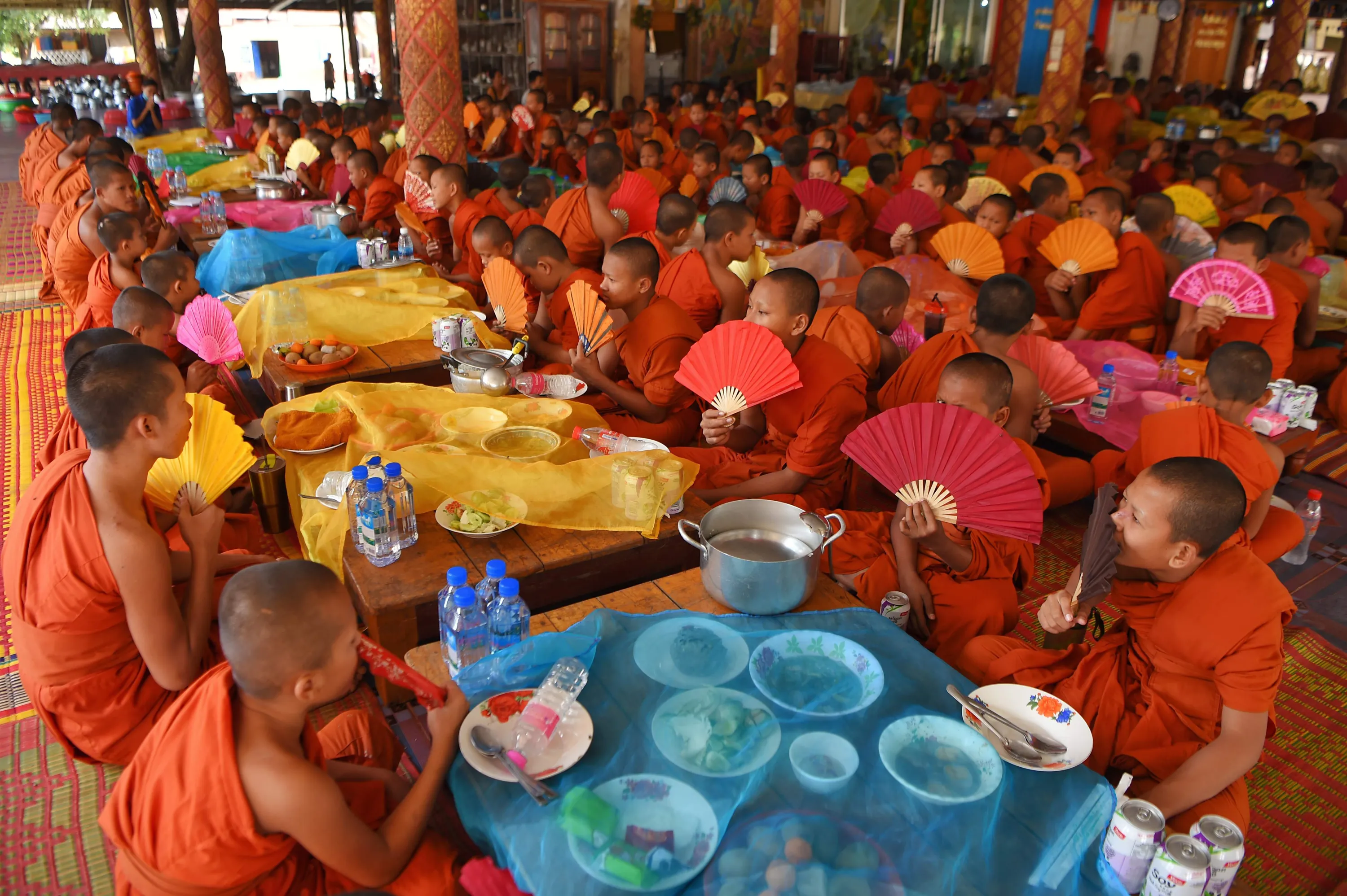 Young Buddhist monks pray before lunch at a temple in Samrong district in Cambodia's Takeo province on the outskirts of Phnom Penh on January 23, 2021. (Photo by Tang Chhin Sothy/AFP Photo)