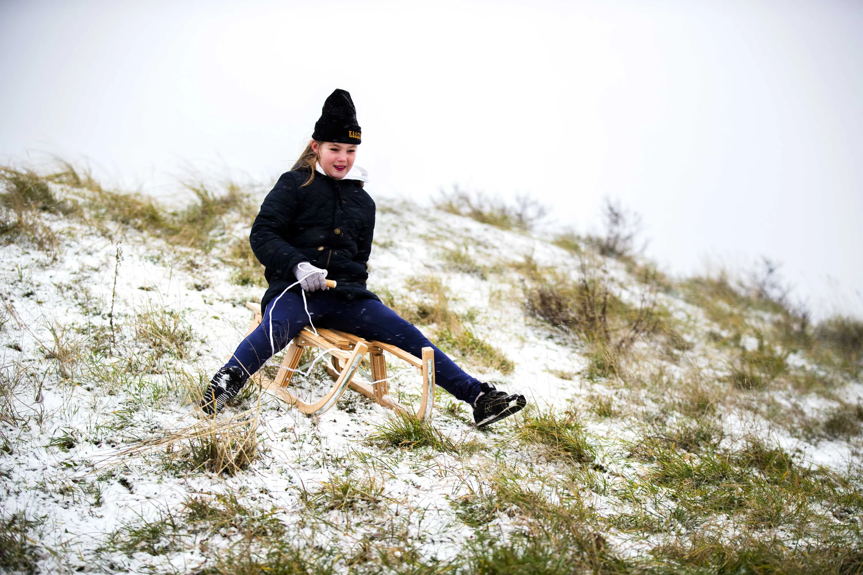 A girl sits on a sledge with little snow in Zandvoort, Netherlands, 16 January 2021. In some parts on the country snow fell around three centimeters high. (Photo by Remko de Waal/EPA/EFE)