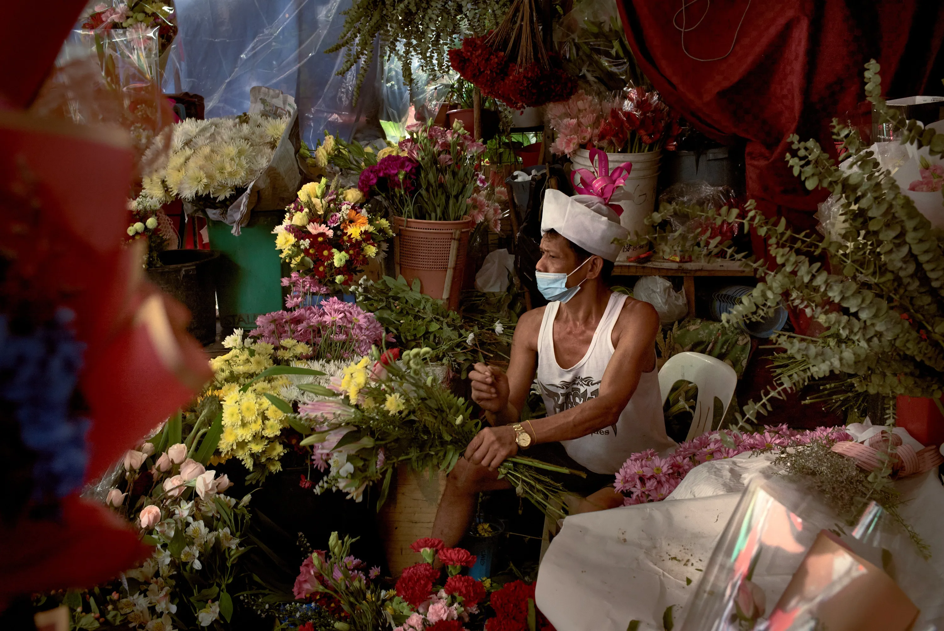 Filipino flower vendors preparing their products on the eve of Valentines day amidst the threat of new variants of the Corona Virus, on February 13, 2021 in Manila, Philippines. (Photo by Jes Aznar/Getty Images)
