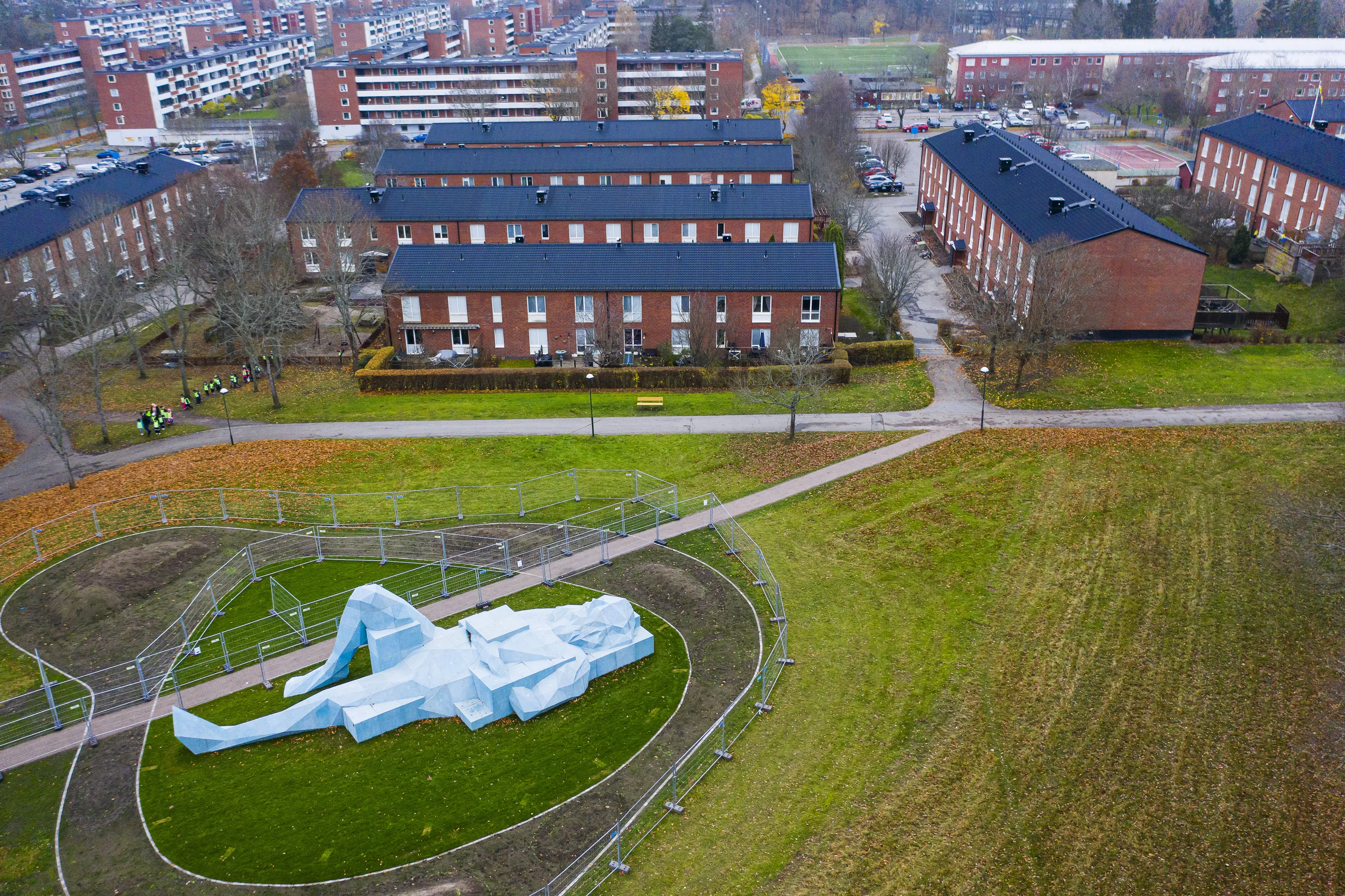 This aerial view photo shows one of two “Varbergs Giants”, a giant sculpture by French artist Xavier Veilhan displayed in Varberg, south of Stockholm on November 12, 2020. French artist Xavier Veilhan won the first prize in the art competition of the city of Stockholm announced in 2018 as part of the urban development project Fokus Skarholmen. The giants together consist of 89 large sky-blue concrete blocks assembled into finished sculptures. The largest blocks weigh six tons each. (Photo by Jonathan Nackstrand/AFP Photo)
