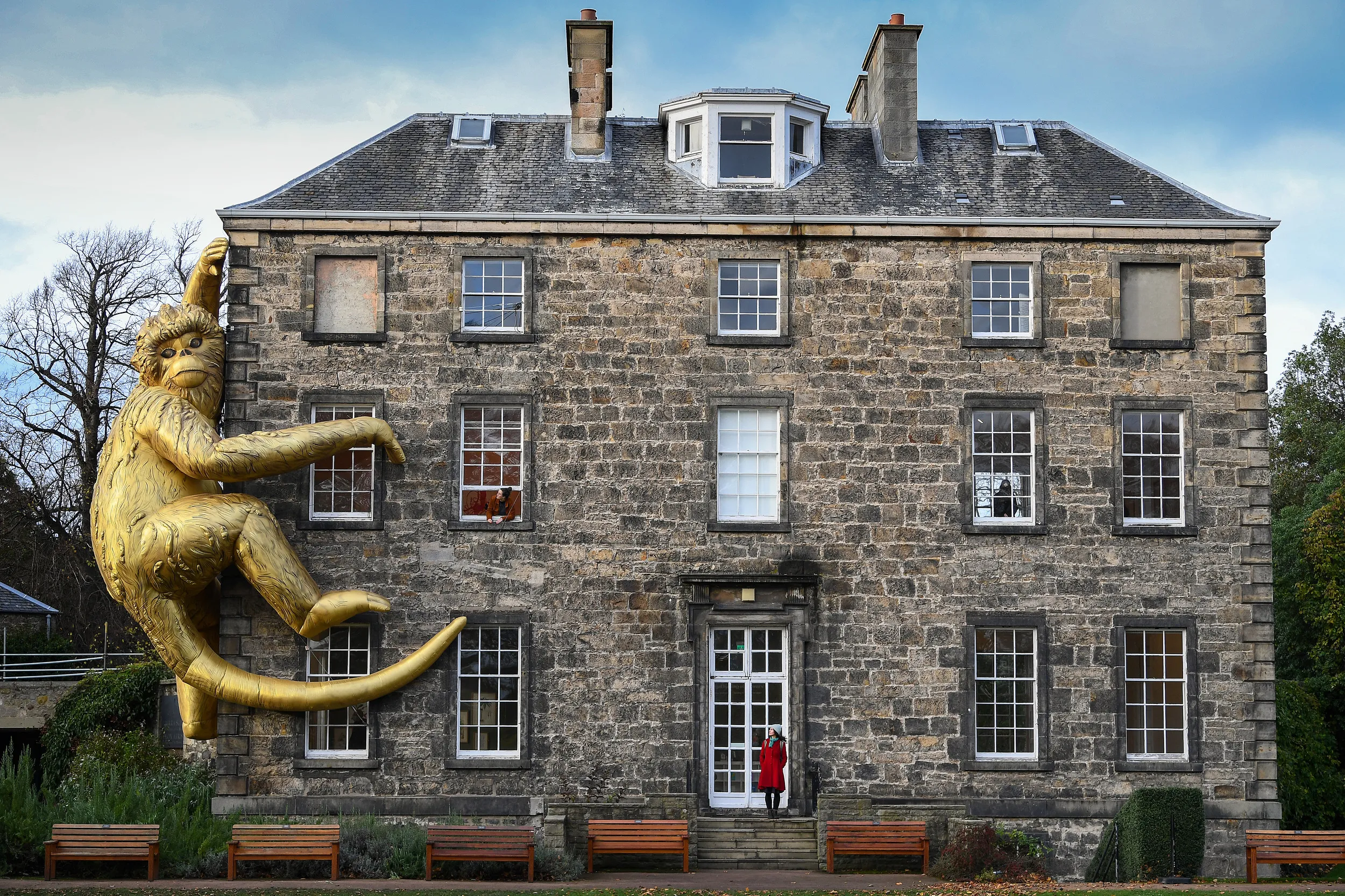 Members of the public view a 45ft tall giant golden monkey on the side of Inverleith house on November 04, 2020 in Edinburgh, Scotland. The inflatable Golden Monkey installation, by Australian ecological artist Lisa Roet, has previously adorned scaled skyscrapers in Beijing and Hong Kong. (Photo by Jeff J. Mitchell/Getty Images)