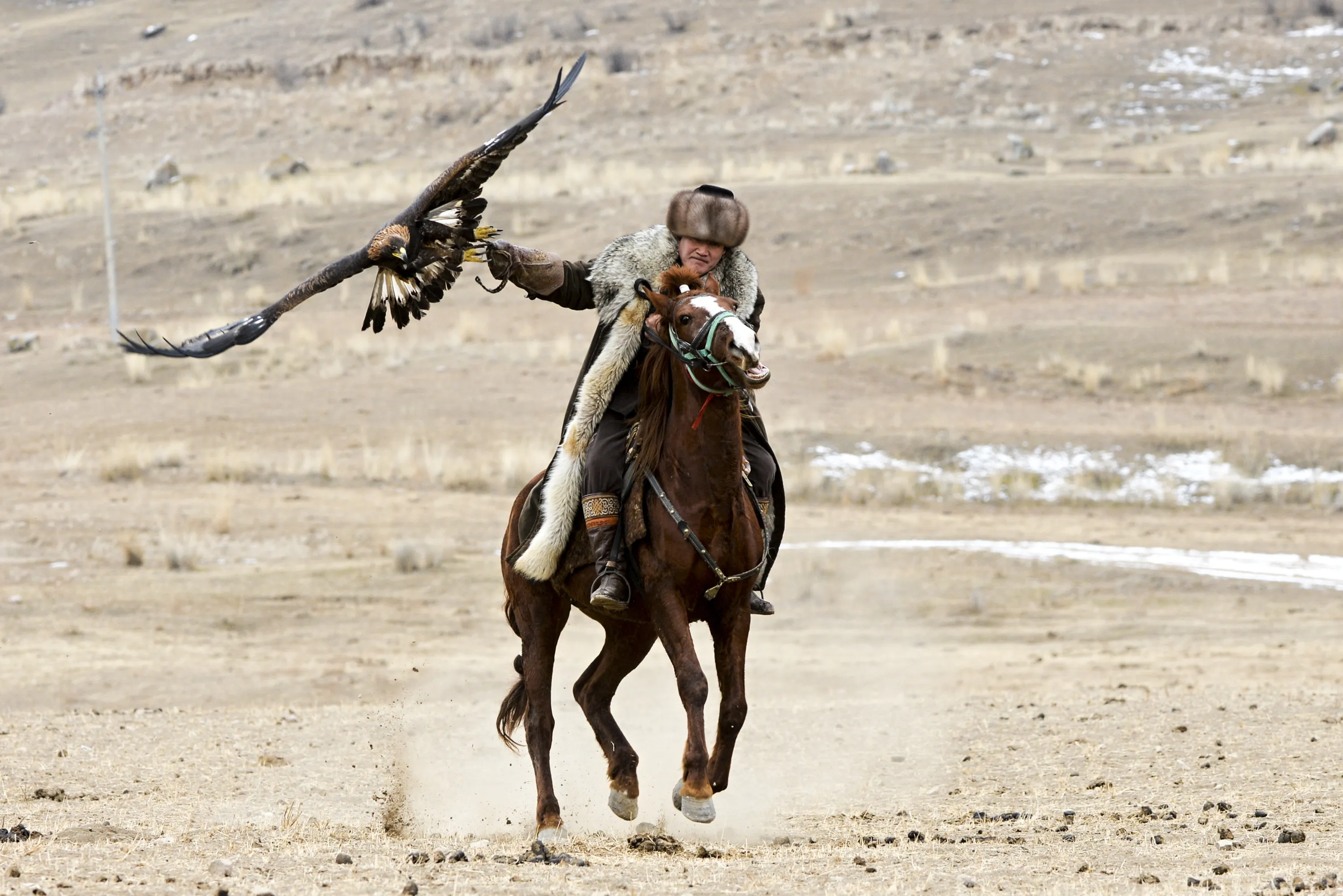 A Kyrgyz man rides a horse holding a golden eagle for an eagle hunt during the hunting festival “Salburun” in Tuura-Suu, a small village nestled among the mountains, about 250 km. (156 miles) south-east of Bishkek, Kyrgyzstan, Tuesday, February 23, 2021. Salburun comes from the nomadic tradition of hunting and protecting herds from predators such as wolves. (Photo by Vladimir Voronin/AP Photo)