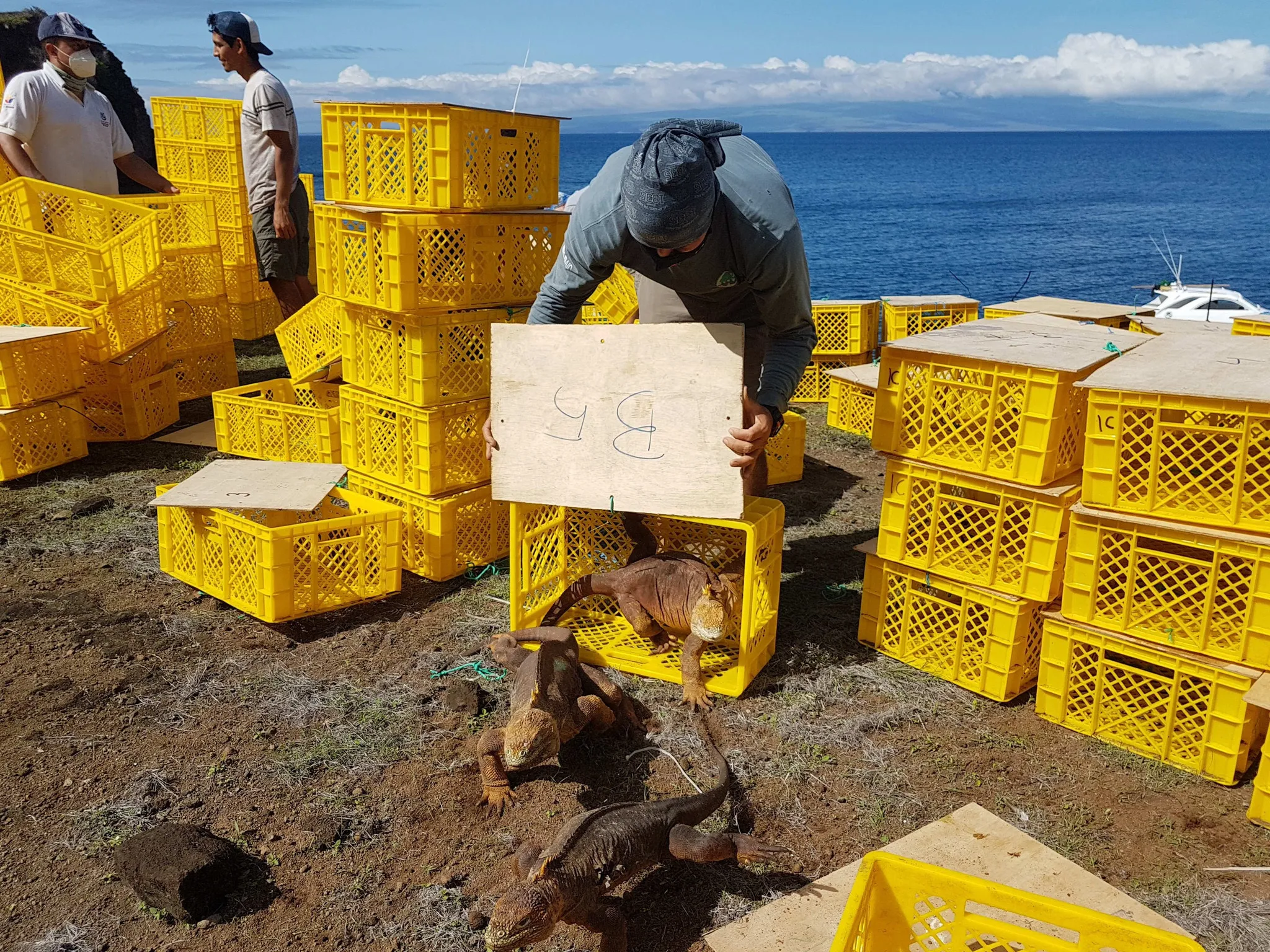 A handout photo made available by Galapagos National Park shows the reinsertion of 461 land iguanas on Santiago Island, Galapagos, 13 February 2021. Technicians from the Galapagos National Park reinserted 461 land iguanas on Santiago Island from another island in the Ecuadorian archipelago in order to return these reptiles to a habitat from which they had become extinct. (Photo by Galapagos National Park/EPA/EFE)