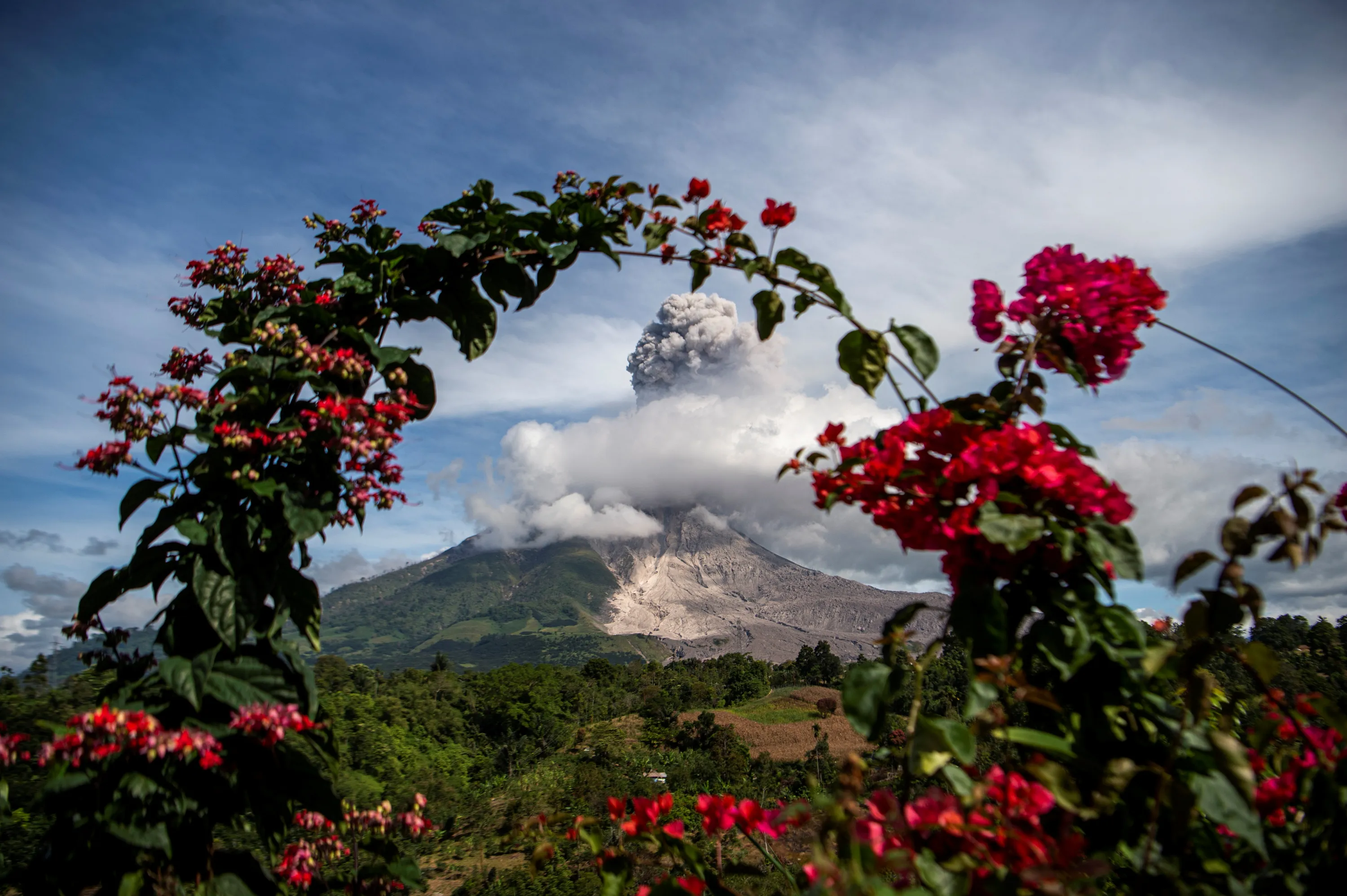 Mount Sinabung volcano spews hot ash and volcanic materials as it erupts, as seen from Tiga Pancur village in Karo, North Sumatra province, Indonesia, February 25, 2021 in this photo taken by Antara Foto. (Photo by Nova Wahyudi/Antara Foto via Reuters)