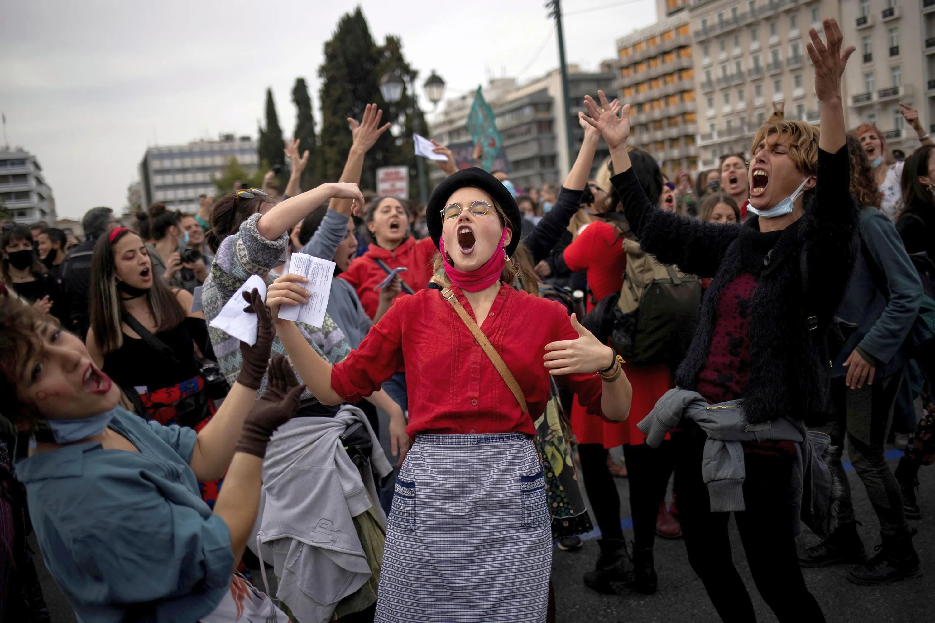 People dance and sing during a demonstration to mark International Women's Day in front of the parliament building in Athens, Greece, March 8, 2021. (Photo by Alkis Konstantinidis/Reuters)