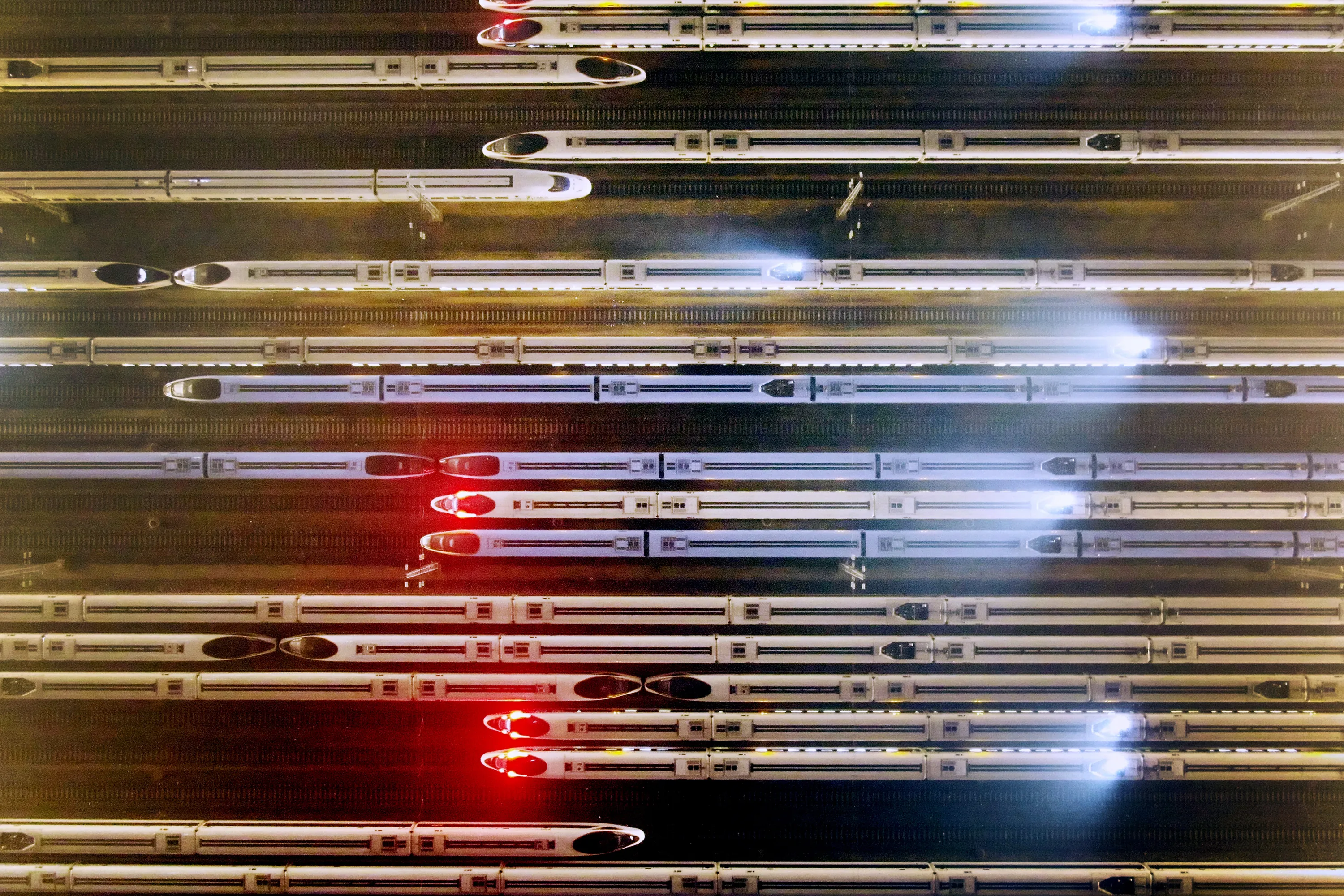 Aerial view of high-speed trains sitting parked at a maintenance base on the first day of the 40-day Spring Festival travel rush on January 28, 2021 in Nanjing, Jiangsu Province of China. (Photo by Yang Bo/China News Service via Getty Images)