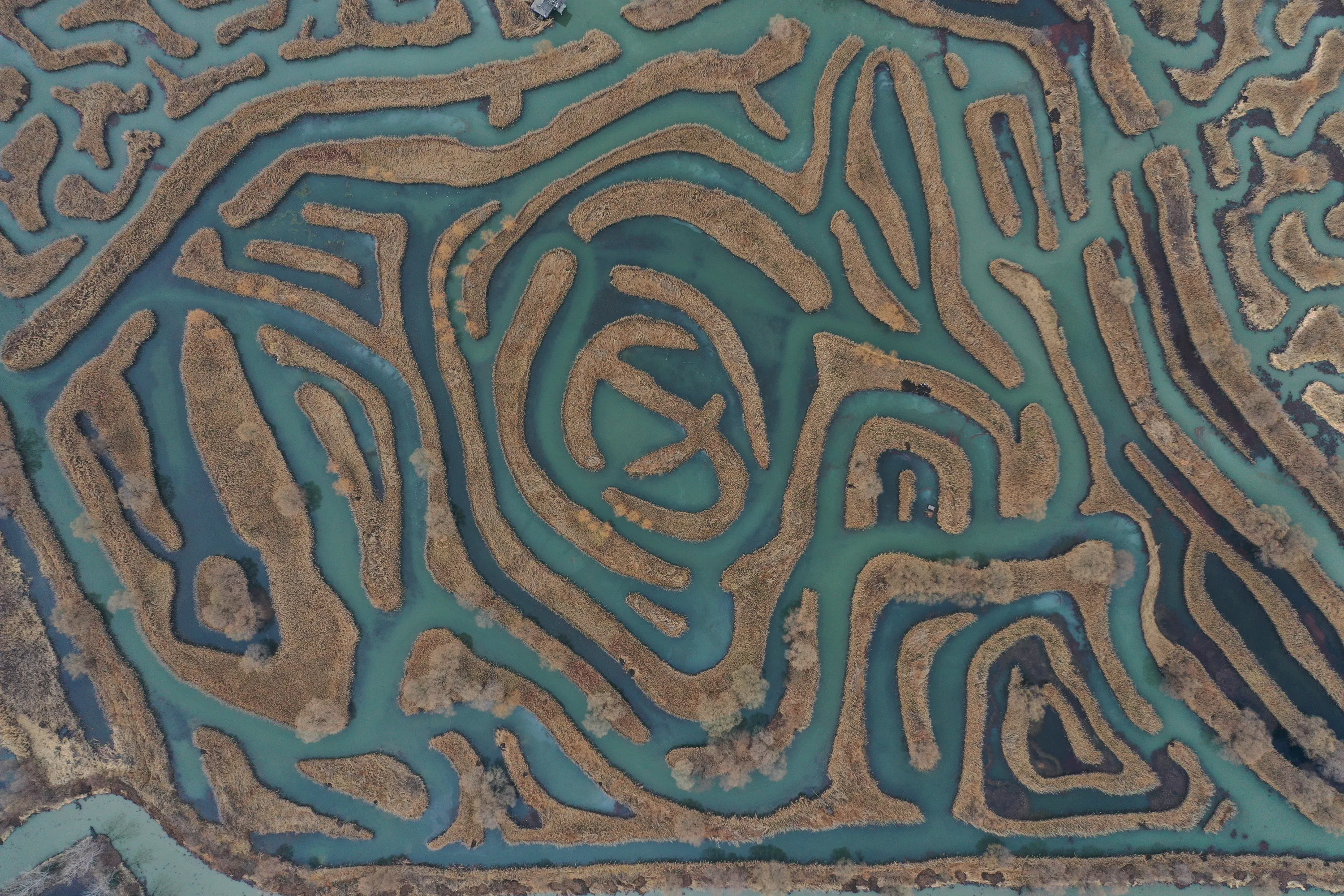 An aerial view of China's largest water reed maze, in the Dazong Lake Wetland Park in Yancheng in east China's Jiangsu Province on January 4, 2021. (Photo by Feature China/Barcroft Media via Getty Images)