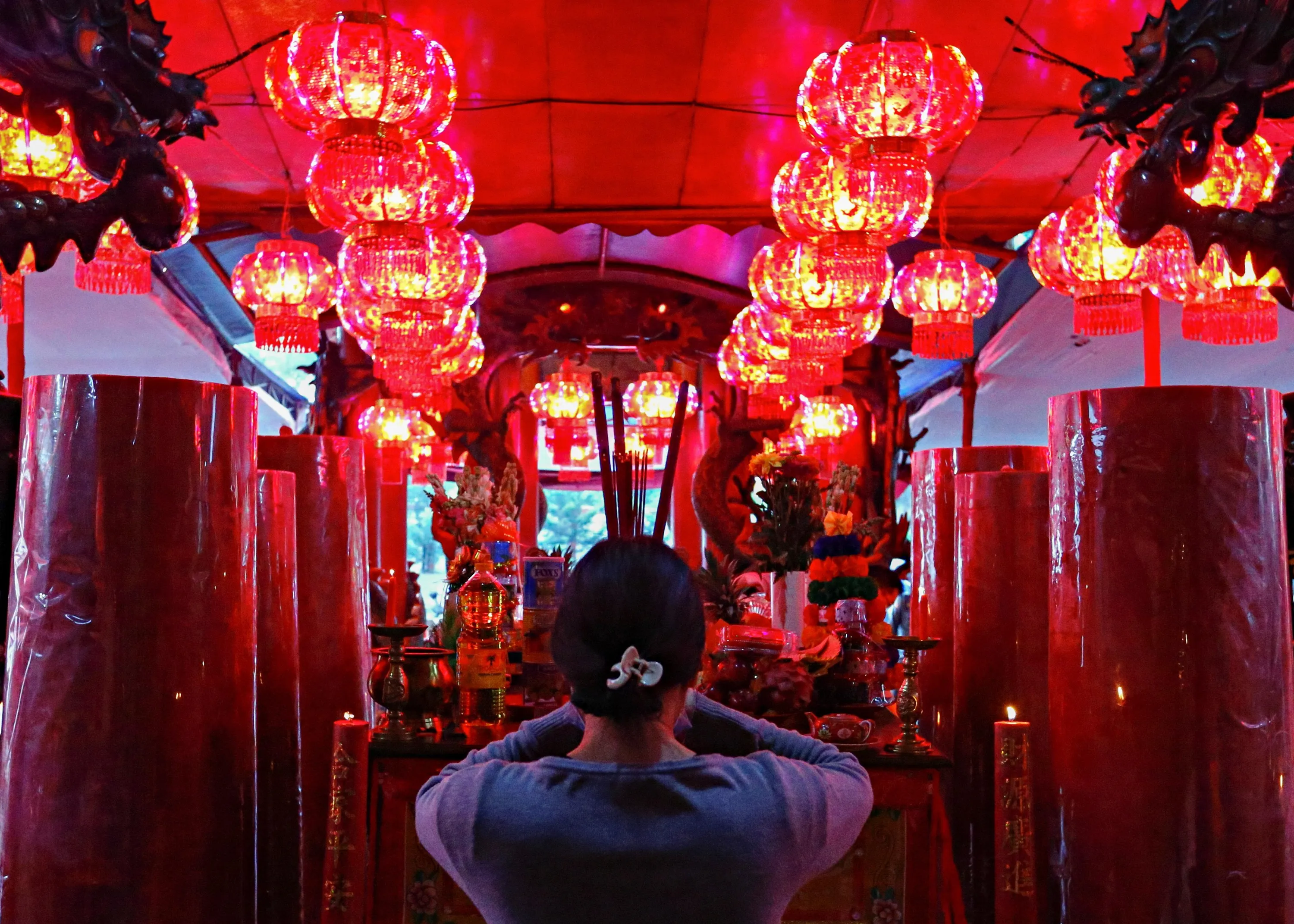 A worshipper holding incense sticks prays during the Chinese Lunar New Year's eve at a temple in Jakarta, Indonesia, February 11, 2021. (Photo by Ajeng Dinar Ulfiana/Reuters)