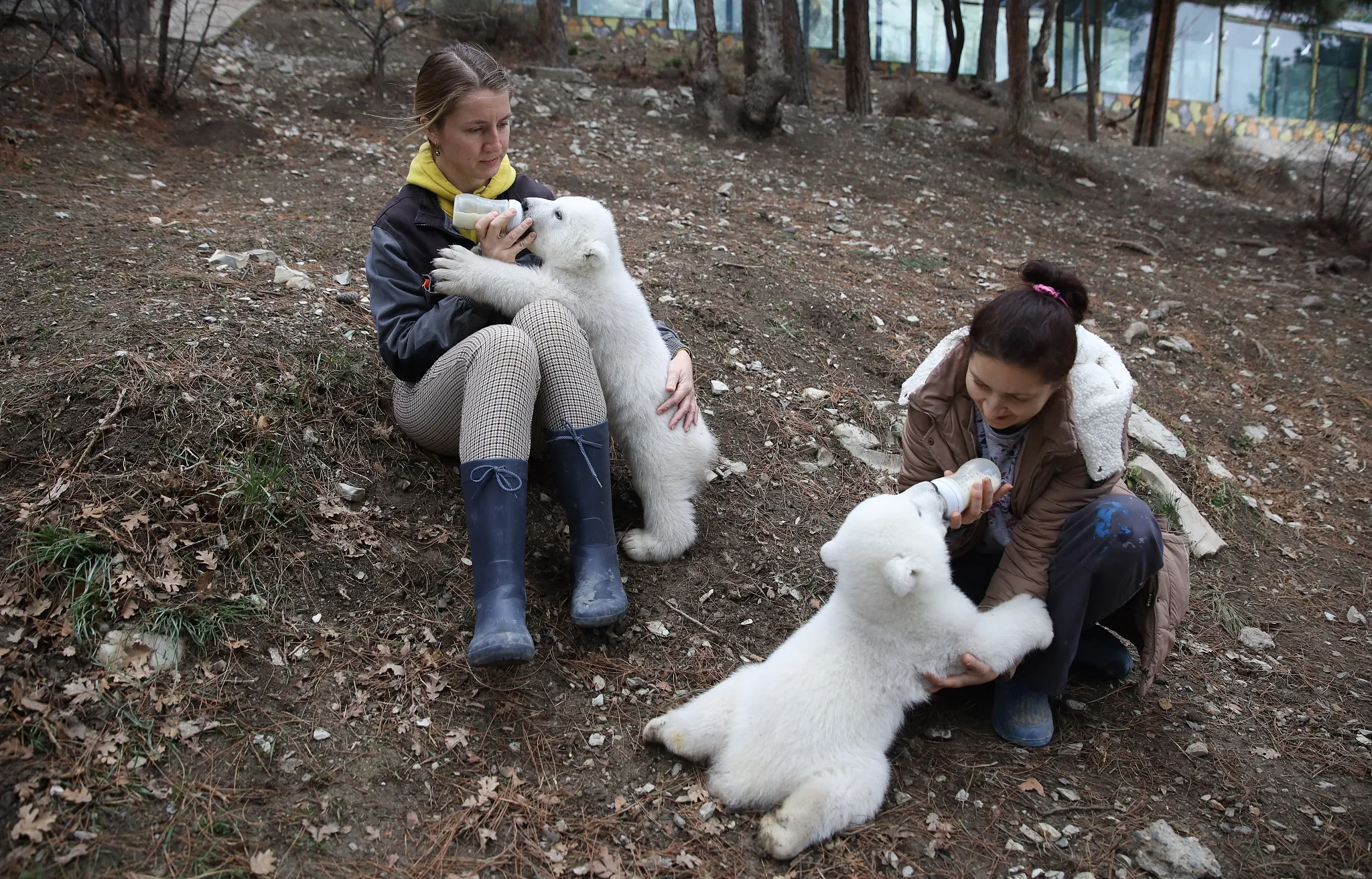 Two fluffy polar bear cubs are seen playing with each other at the Gelendzhik Safari Park in southern Russia, February 27, 2021. Born on January 7, 2021, the two cubs were taken by the park staff as their mother abandoned them. Their human foster mothers take over the rearing responsibilities and look after them carefully. (Photo by VCG/Stringer)