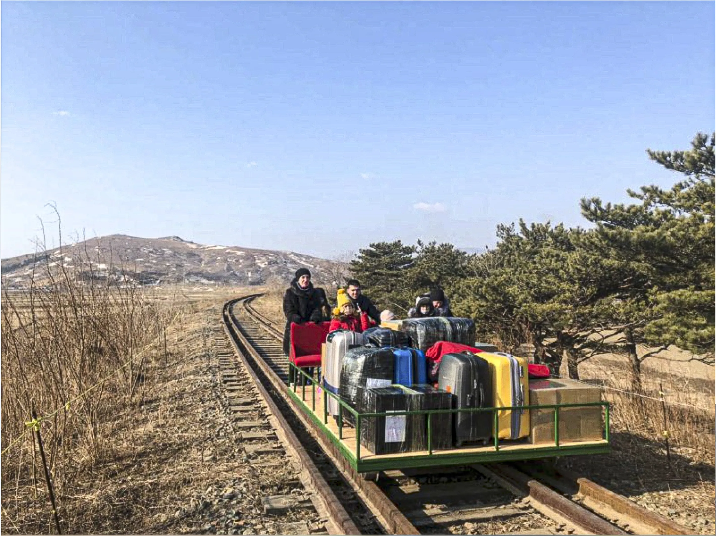 In this image taken from a video released by Russian Foreign Ministry Press Service Thursday, February 25, 2021, a group of Russian diplomats push hand-pushed rail trolley with their children and suitcases to the border with Russia. A group of Russian diplomats and their family members returned to Russia from North Korea on a hand-pushed rail trolley on Thursday because of COVID-19 restrictions in the country, Russia's Foreign Ministry said in a Facebook post. (Photo by Russian Foreign Ministry Press Service via AP Photo)