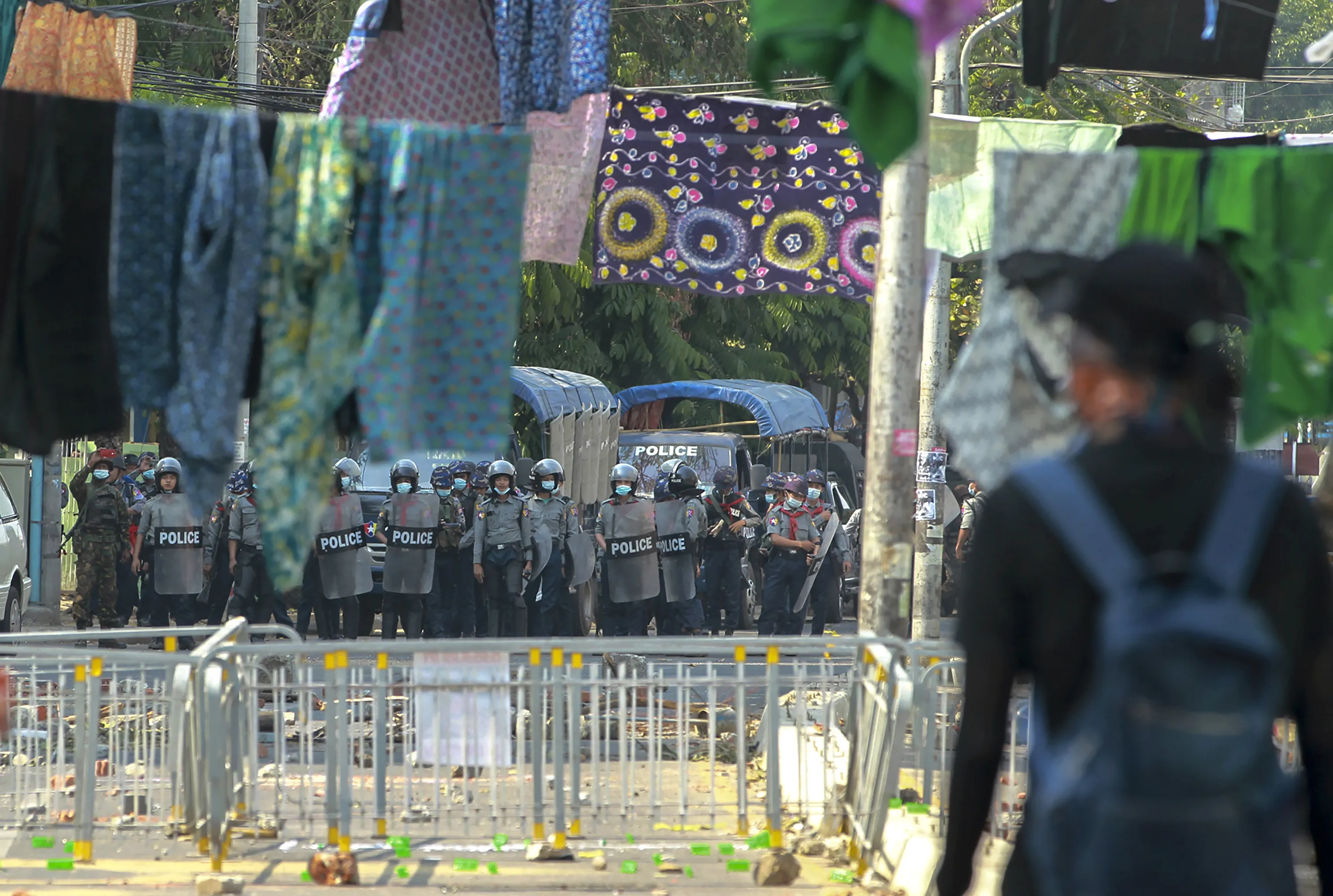 Anti-coup protesters stand behind a line of women's clothing hanged across a road to deter security personnel from entering the protest area in Yangon, Myanmar Tuesday, March 9, 2021. In Burmese culture, walking underneath women's clothing is believed to weaken the power of men and bring bad fortune. (Photo by AP Photo/Stringer)
