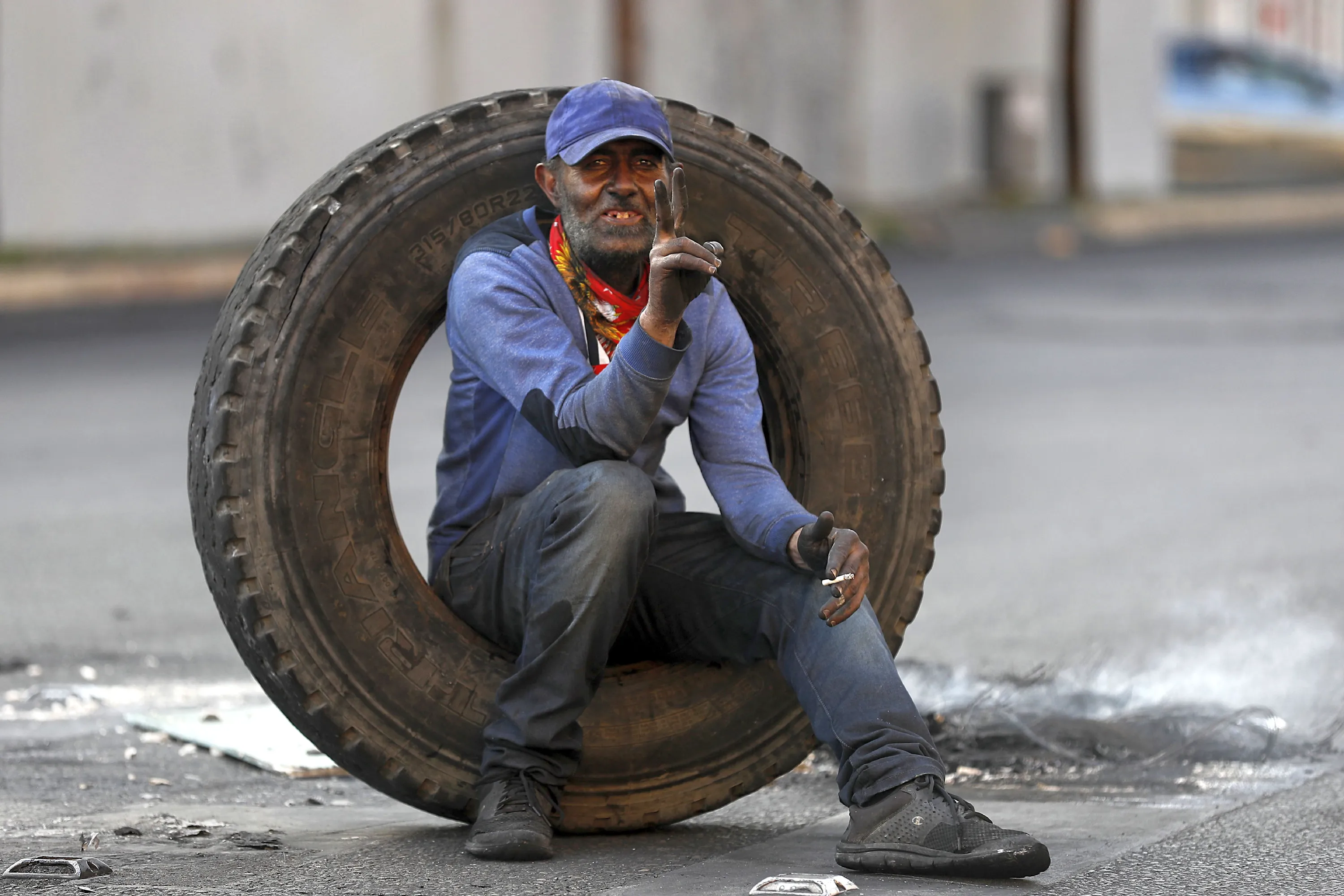 In this March 8, 2021 file photo, a protester flashes a victory sign as he aims to block a road during a protest, in Beirut, Lebanon. It's an expression of anger but also of helplessness: Dense palls of smoke rising around Beirut and other parts of Lebanon from burning tires that anti-government protesters are using to block roads. The tactic has become the hallmark of a new flare-up of demonstrations against an intransigent political class that does nothing as its country slides toward the political and economic abyss. (Photo by Hussein Malla/AP Photo/File)