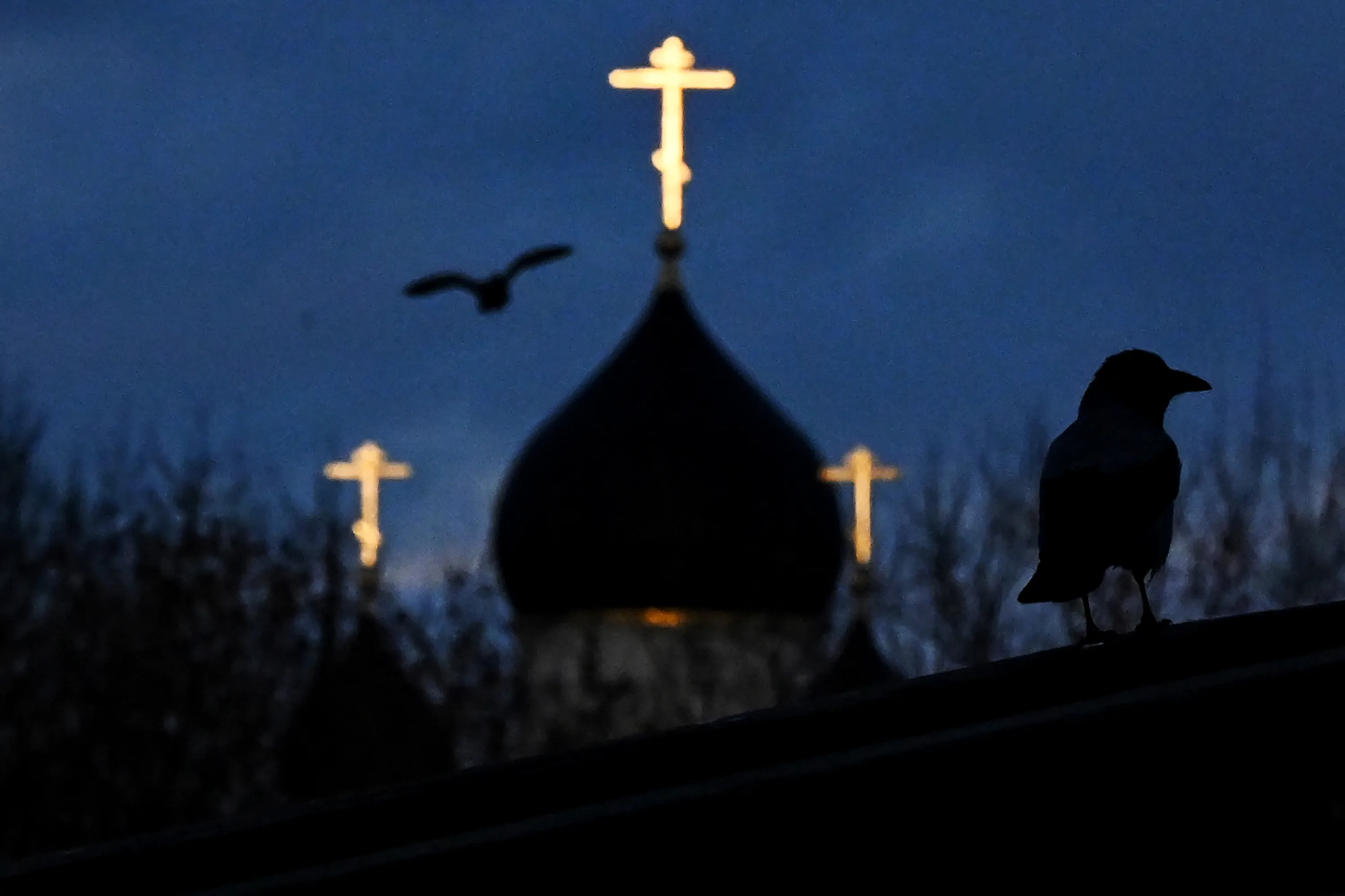 A bird flies in front of a church at sunset on the outskirts of Moscow on March 3, 2021. (Photo by Kirill Kudryavtsev/AFP Photo)