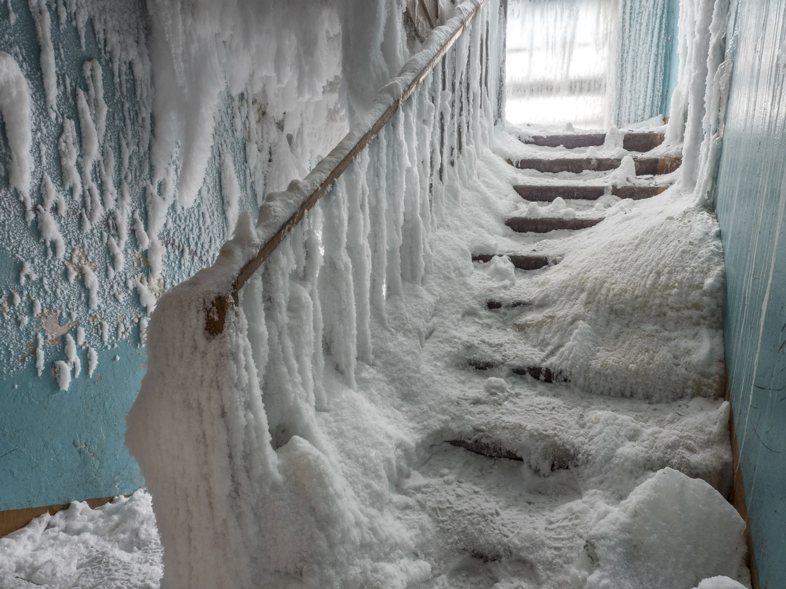 An inside view from snow and ice covered abandoned building in Severny region, 17 kilometers from coal-mining town Vorkuta, Komi Republic, Russia on March 01, 2021. (Photo by Maria Passer/Anadolu Agency via Getty Images)