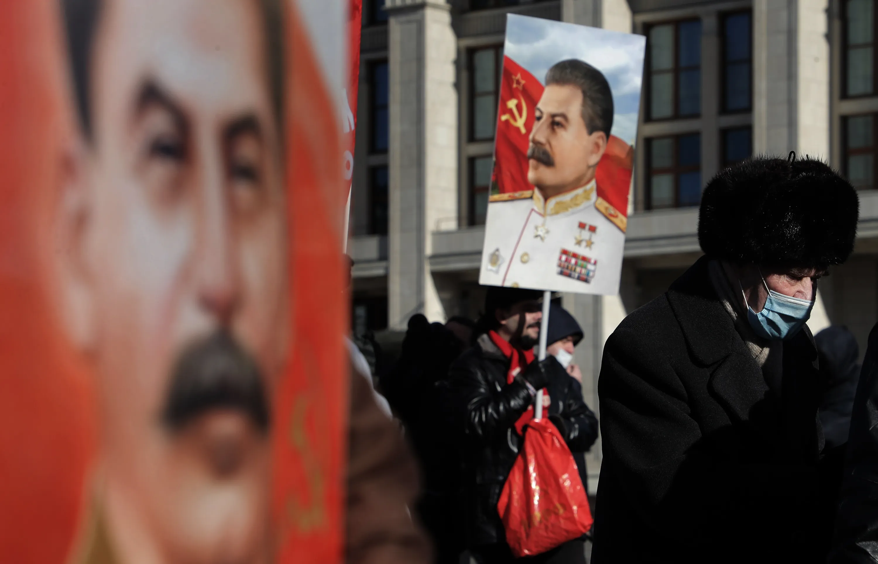 A Communist party supporter holds a portrait of former Soviet leader Joseph Stalin during a wreath laying ceremony at Joseph Stalin'stomb as communists mark the 68th anniversary of his death near the Kremlin wall in the Red Square in Moscow, Russia, 05 March 2021. Josef Stalin died on 05 March 1953 at the age of 74. (Photo by Maxim Shipenkov/EPA/EFE)