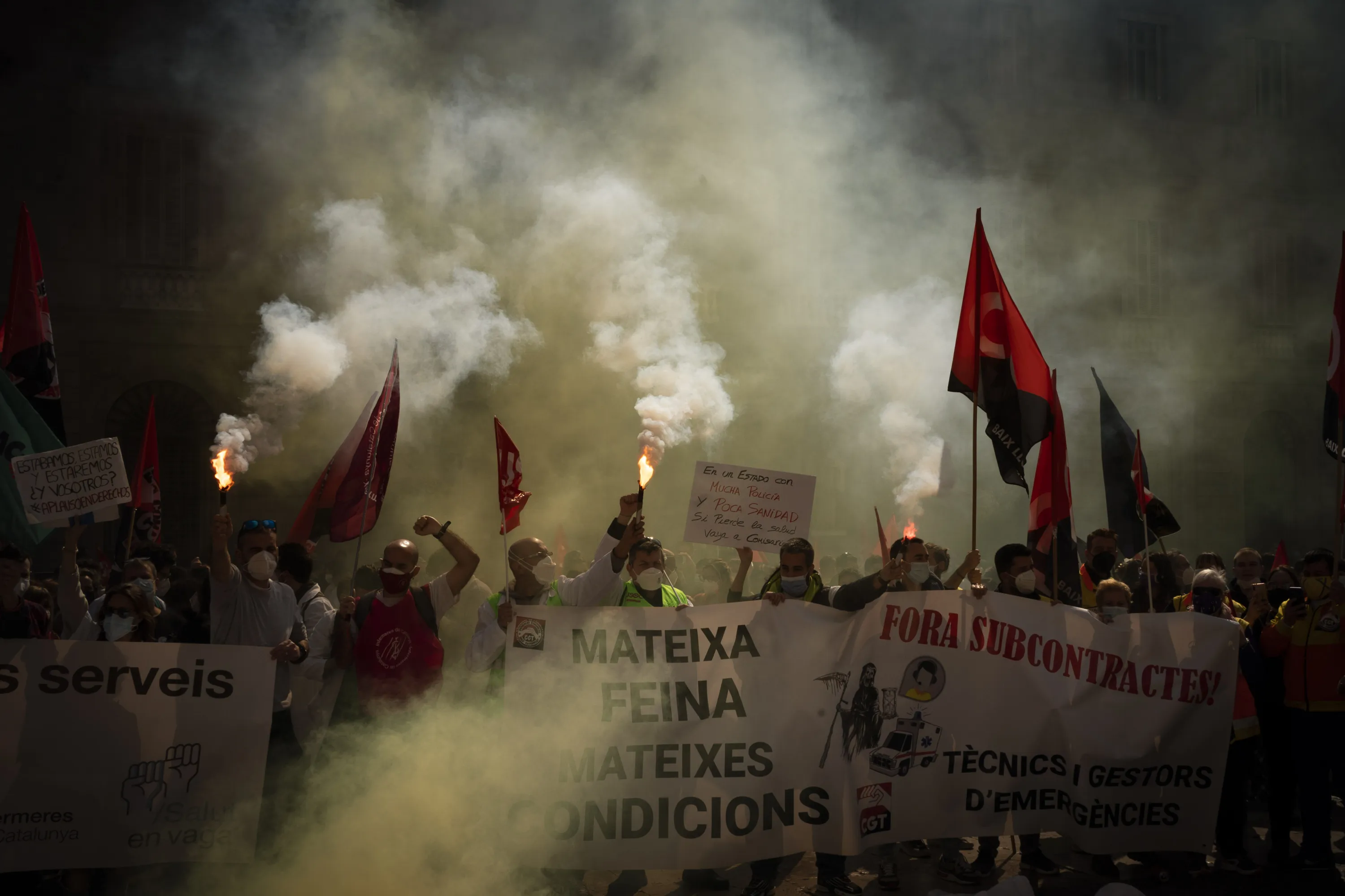Health workers hold flares in front of the Palace of the Generalitat, the headquarter of the Government of Catalonia, as they take part in a protest against their working conditions in Barcelona, Spain, Wednesday, March 10, 2021. (Photo by Emilio Morenatti/AP Photo)