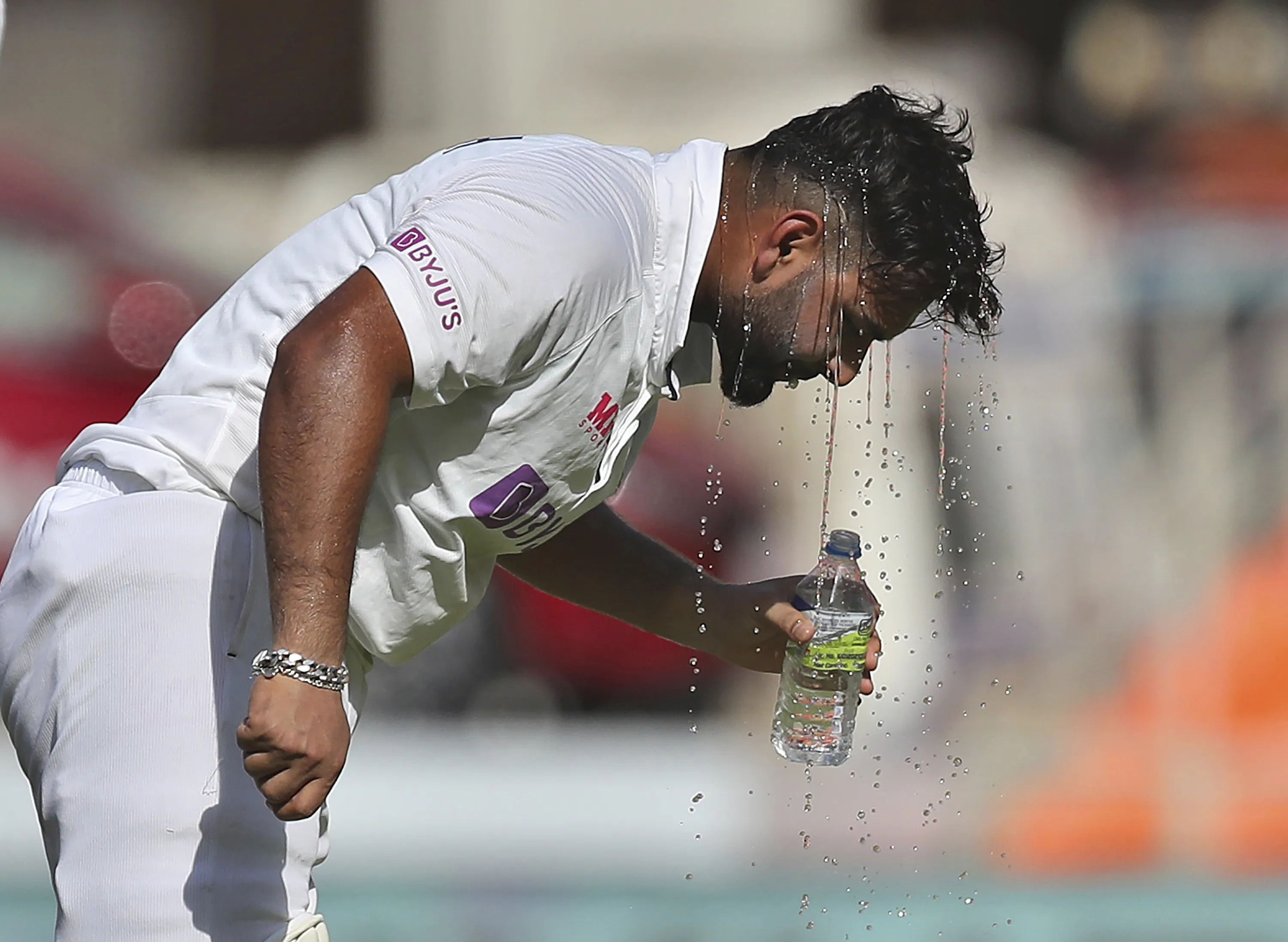 India's Rishabh Pant pours cold water on his head to beat the heat drinks water during the second day of fourth cricket test match between India and England at Narendra Modi Stadium in Ahmedabad, India, Friday, March 5, 2021. (Photo by Aijaz Rahi/AP Photo)
