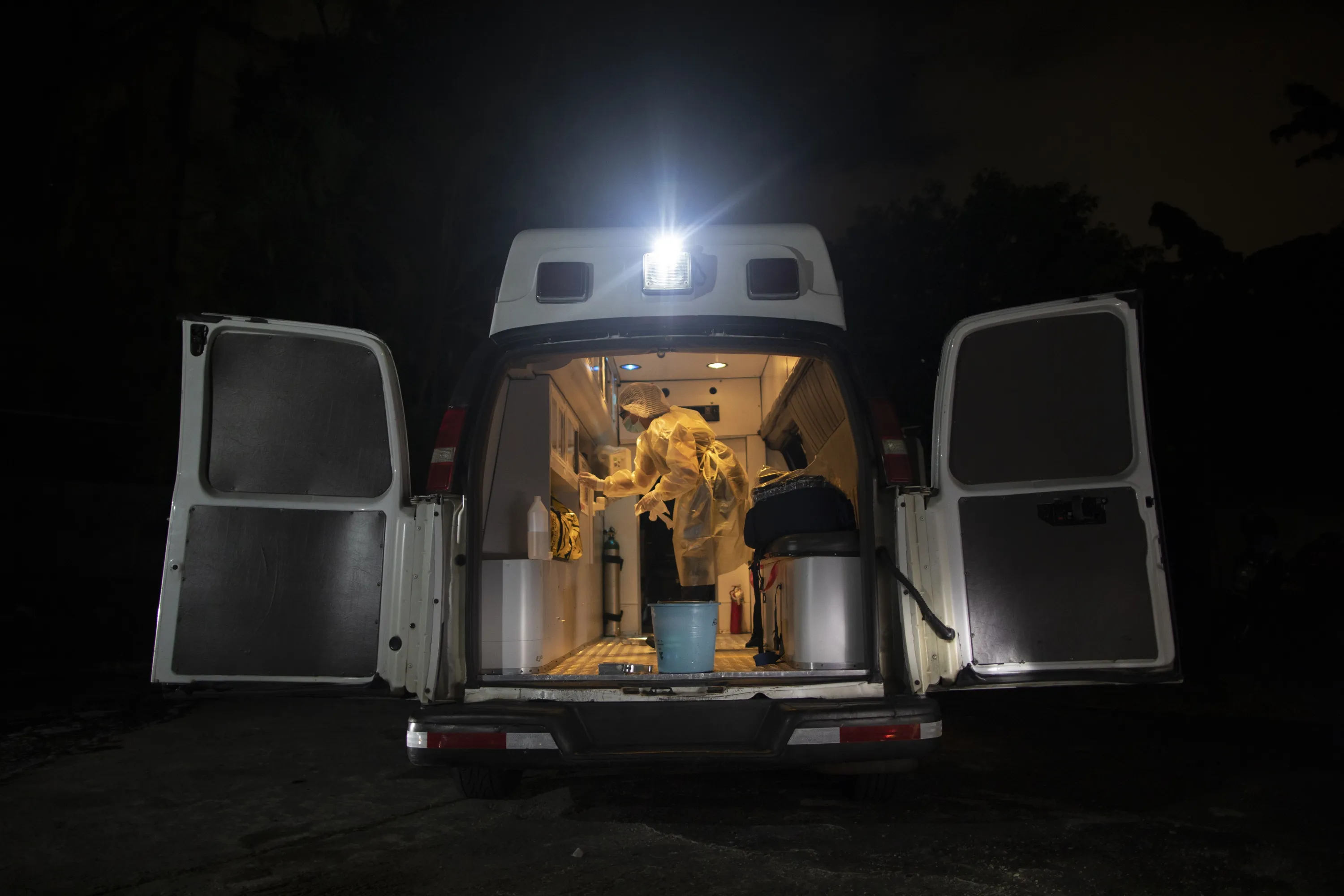 Angels of the Road volunteer paramedic Zully Rodiz disinfects the group's one ambulance after transporting a patient suspected of having COVID-19, in Caracas, Venezuela, Thursday, February 11, 2021. The self-sufficient volunteer group that seeks its own funding and operates entirely independently of the government is now prioritizing new coronavirus cases. (Photo by Ariana Cubillos/AP Photo)