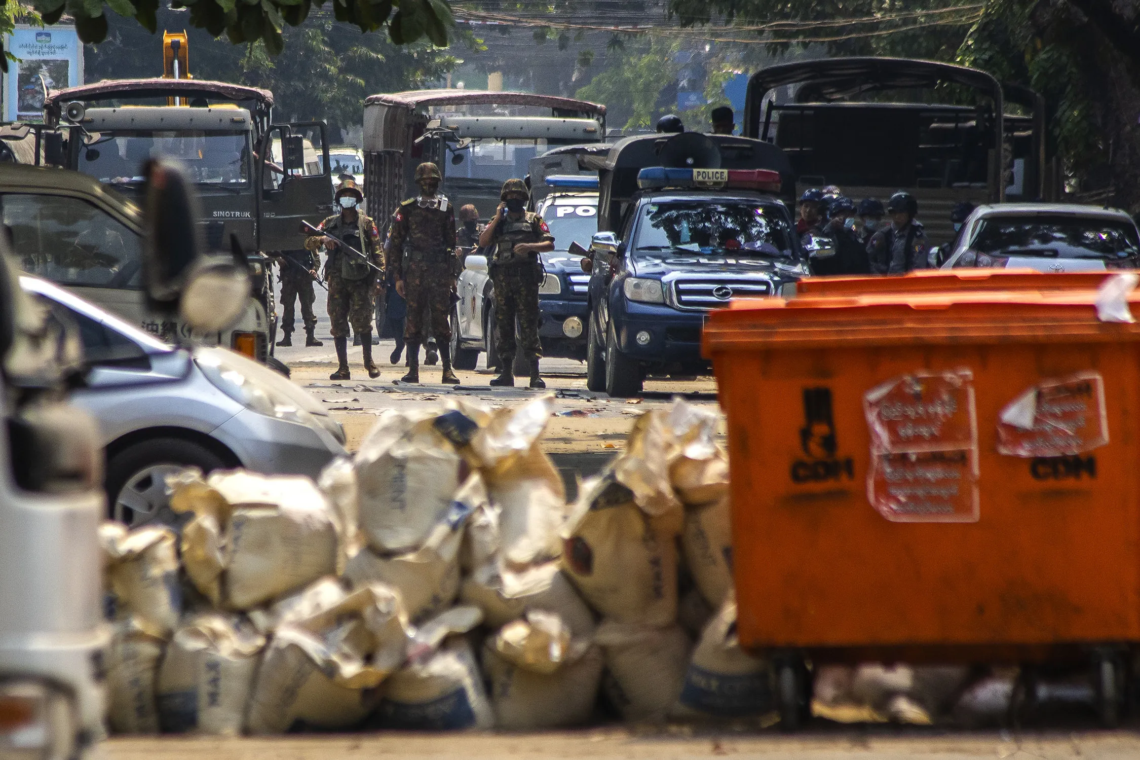Soldiers are seen behind makeshift barricade made by protesters in Yangon, Myanmar, Friday, March 12, 2021. Myanmar's security forces shot to death at least 10 people protesting the military's coup, spurning a U.N. Security Council appeal to stop using lethal force. (Photo by AP Photo/Stringer)