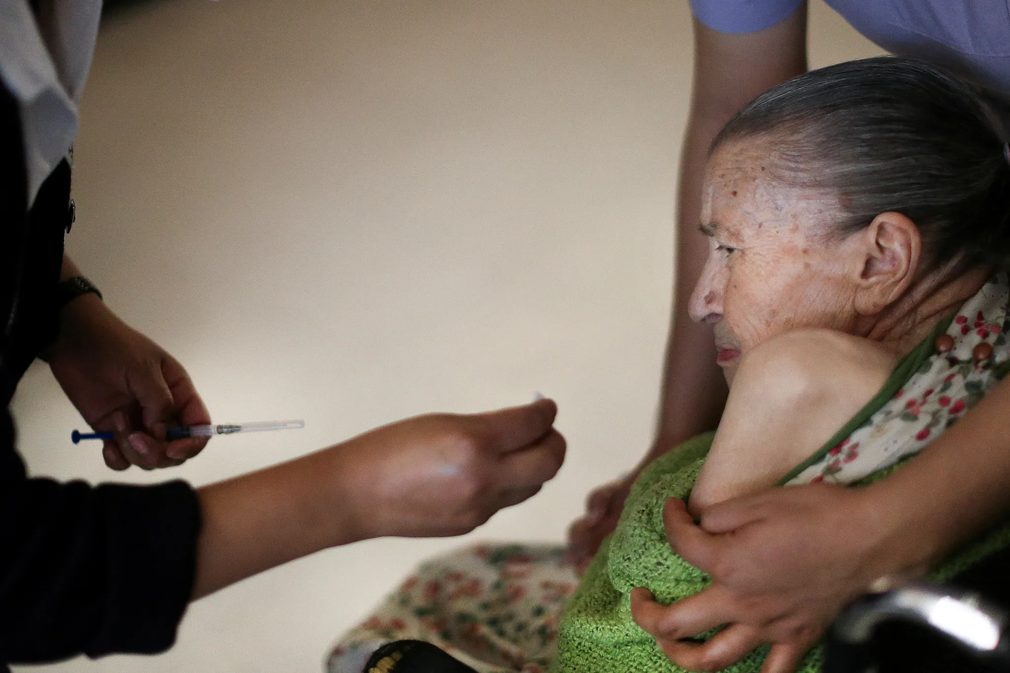 An elderly person reacts before receiving the Pfizer/BioNtech COVID-19 vaccine at Casa Betti nursing home amid the coronavirus disease (COVID-19) pandemic in Mexico City, Mexico on March 11, 2021. (Photo by Edgard Garrido/Reuters)