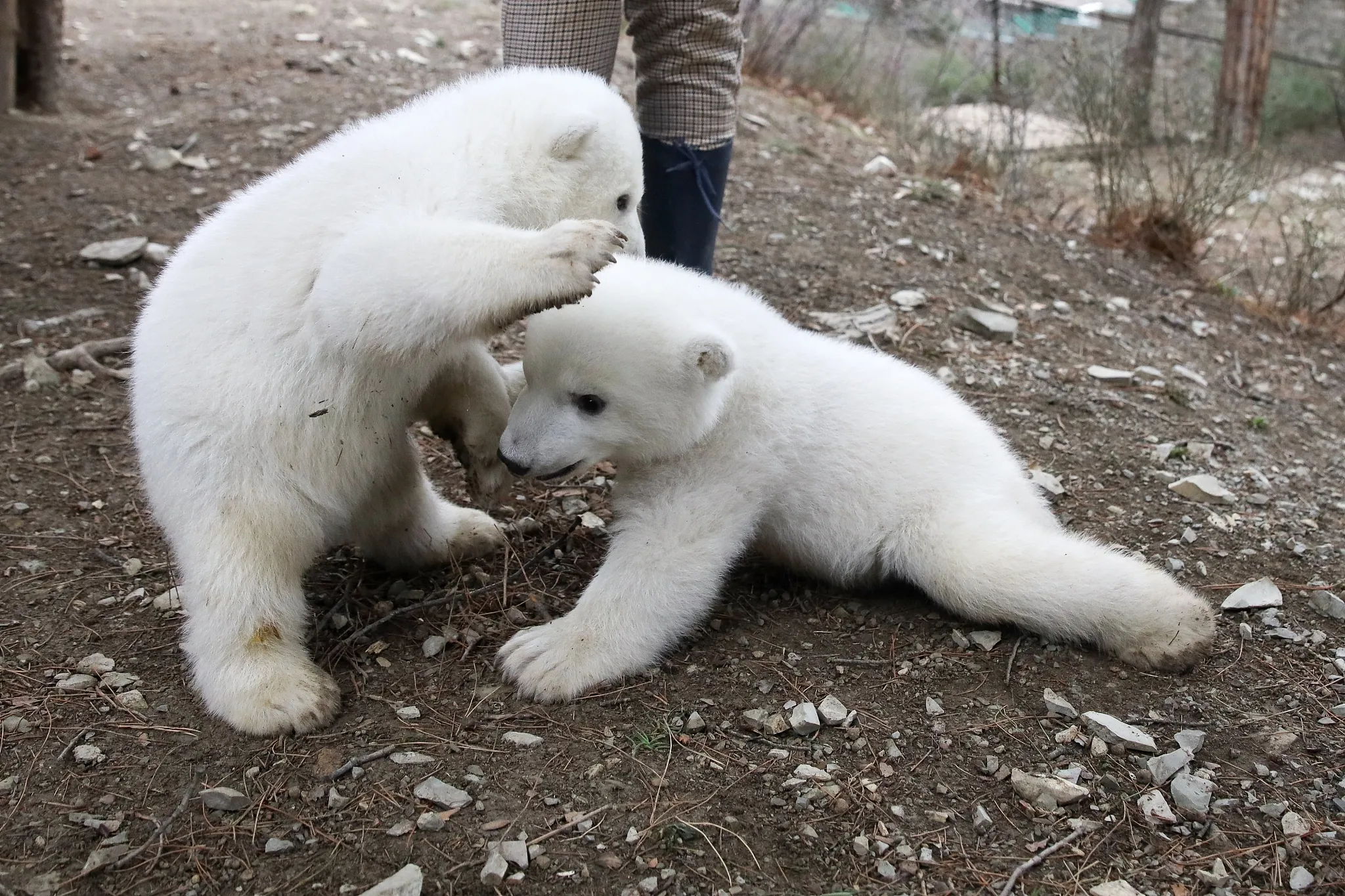 Two fluffy polar bear cubs are seen playing with each other at the Gelendzhik Safari Park in southern Russia, February 27, 2021. Their human foster mothers take over the rearing responsibilities and look after them carefully. (Photo by VCG/Stringer)