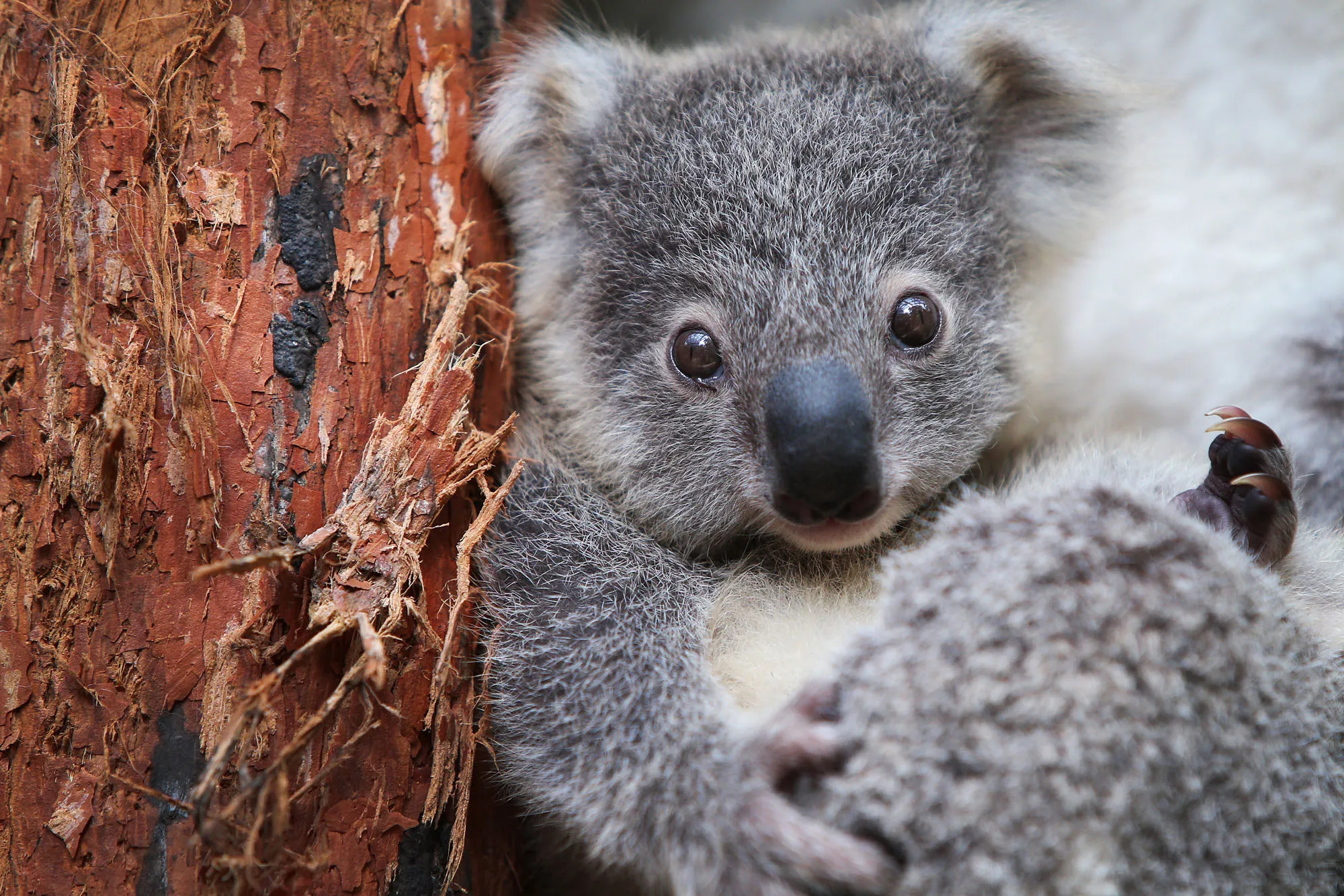 Koala joey Humphrey sits amongst eucalyptus at Taronga Zoo on March 02, 2021 in Sydney, Australia. Eight-month-old Humphrey is the first koala joey born at Taronga Zoo in over a year, and only recently emerged from his mother Willow's pouch. Koala joeys stay in their mother's pouch for up to 6 months and it is only from around that age that they begin to emerge and attach themselves to their mother's back. (Photo by Lisa Maree Williams/Getty Images)