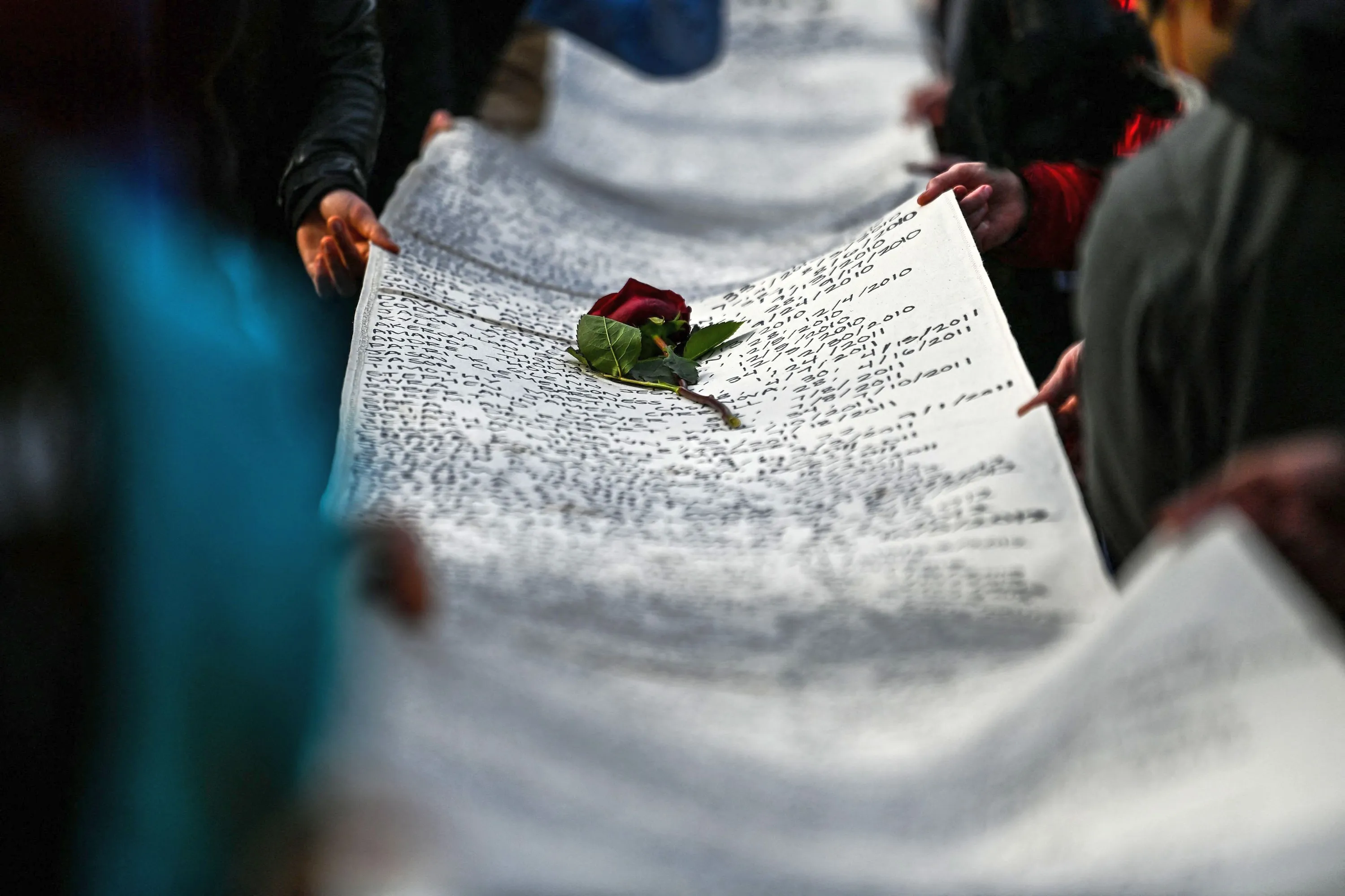 The names of victims of police brutality are written on a banner during the “I Can’t Breathe – Silent March for Justice” in front of the Hennepin County Government Center on March 7, 2021, where the trial of former Minneapolis police officer Derek Chauvin, charged with murdering African American man George Floyd, will begin on March 8, 2021, in Minneapolis, Minnesota. - His name is chanted by demonstrators around the globe. His face is displayed on murals all over the United States. Since his brutal death George Floyd has embodied, more than any other, the Black victims of police violence and racism in the United States. (Photo by Chandan Khanna/AFP Photo)