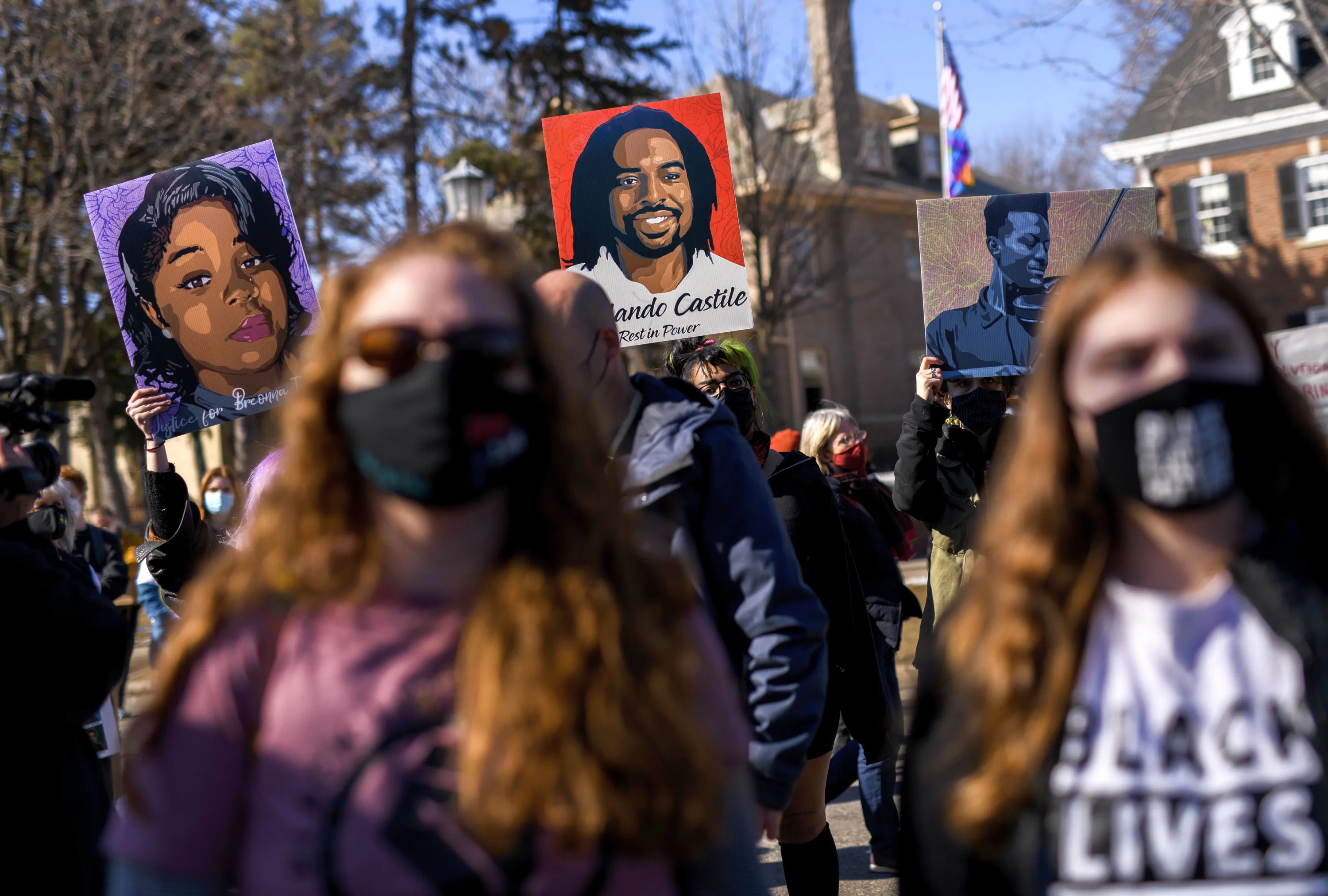 People hold portraits of Breonna Taylor, Philando Castile, and Elijah McClain during a protest demonstration outside the Governors Mansion on March 6, 2021 in St. Paul, Minnesota. A number of protests are scheduled in the days before jury selection is set to begin in the trial of former Minneapolis Police Officer Derek Chauvin on Monday, March 8. (Photo by Stephen Maturen/Getty Images)
