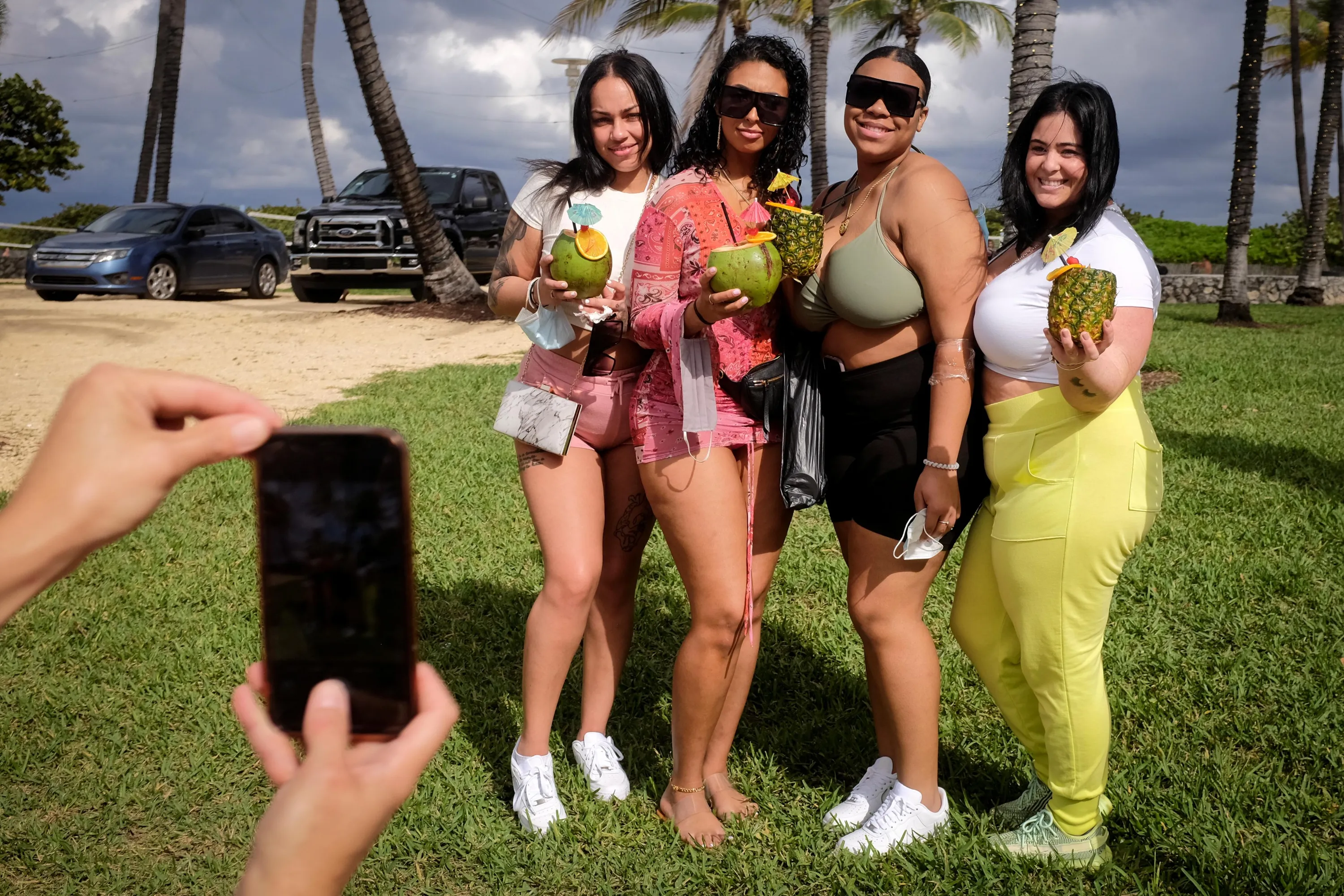 Women pose for a photo in Ocean Drive during spring break festivities, amid the coronavirus disease (COVID-19) outbreak in Miami Beach, Florida, U.S., March 6, 2021. (Photo by Marco Bello/Reuters)